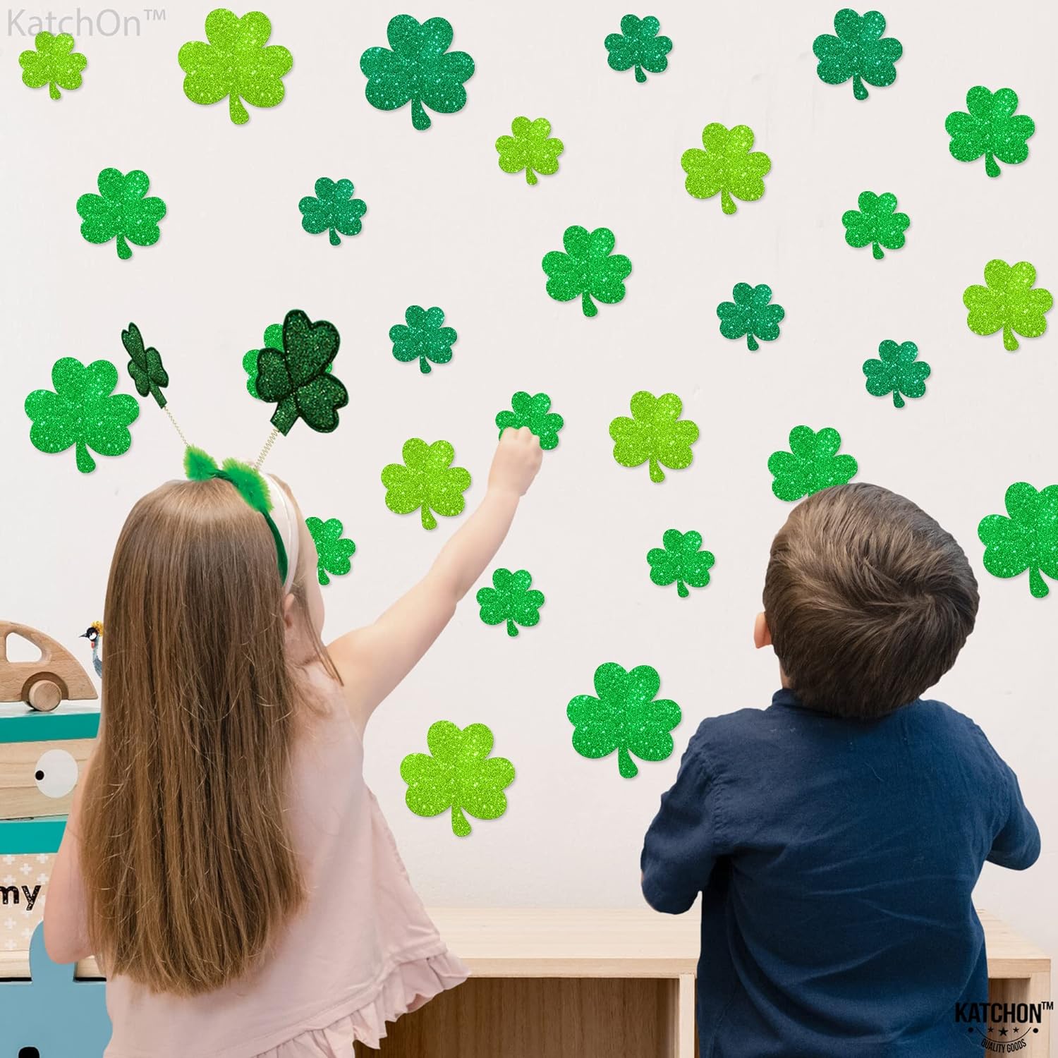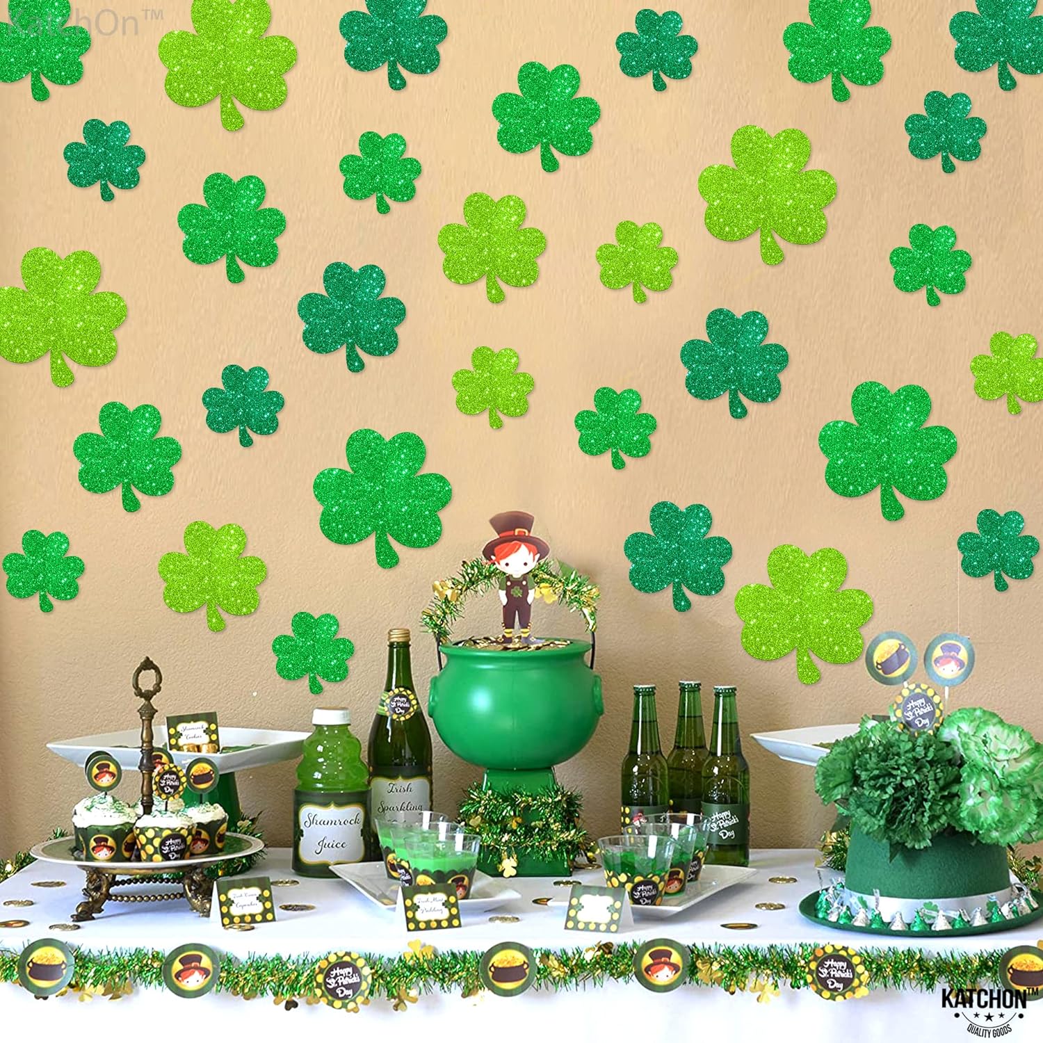 QUALITY MATERIAL | EASY TO DECORATE : The package comes with 100 pieces adhesive dots, with which you can stick onto the back of Irish clover paper cutouts, then you can attach these shamrock decorations to the wall to create any shape or style you like, this clover decorations will be adding a tint of green to your house. You will get pack of 45 clovers of different color and sizes of 6.7, 5.1 and 4 Inch st patricks day glitter cutouts.