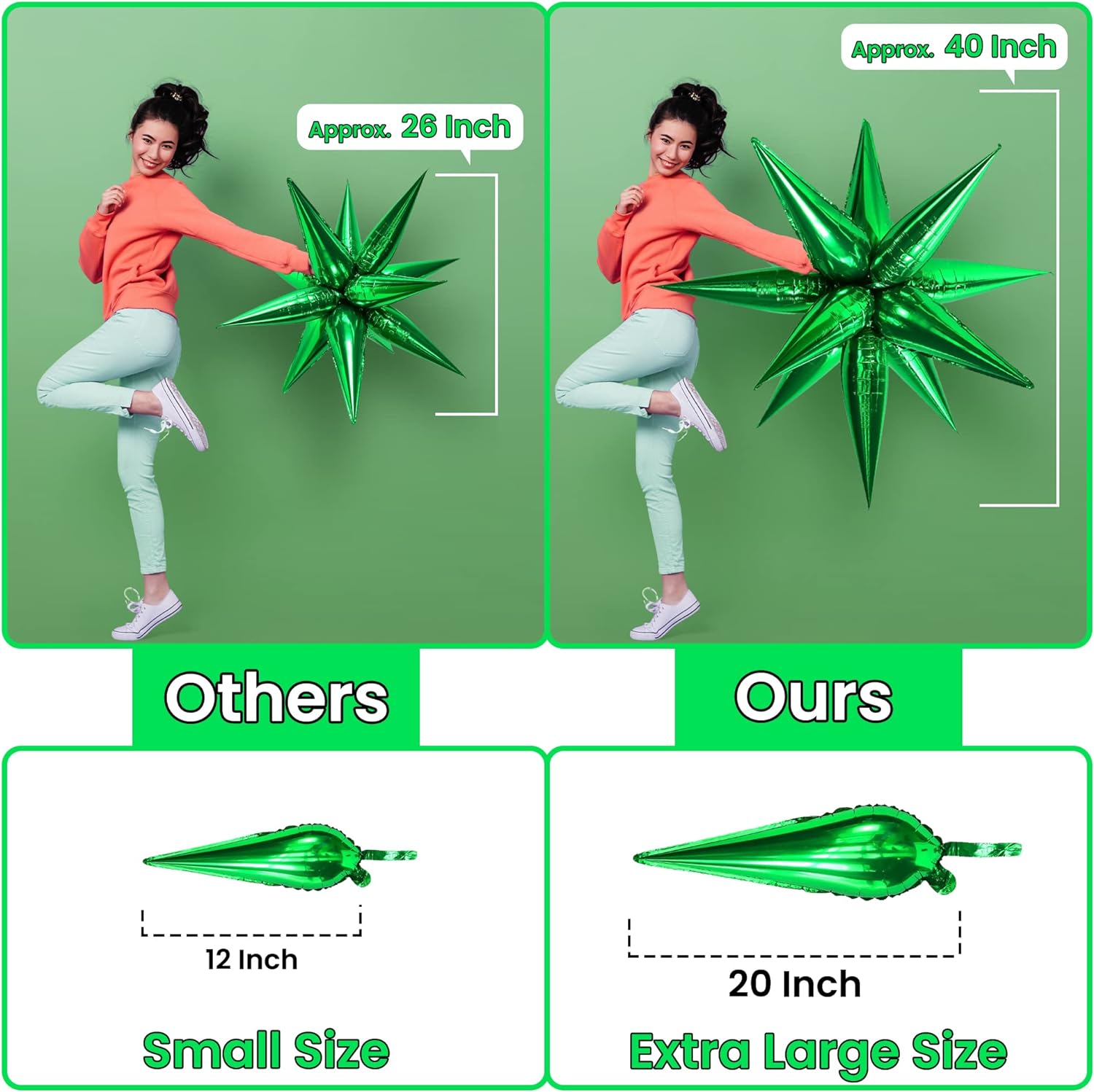 BUY WITH CONFIDENCE | ELEVATE YOUR EXPERIENCE: We are very confident with the quality of these Green foil balloons for st patricks day decorations. If you are not satisfied with these green spike balloons, we care about your experience and feedback. These st patricks day balloons are versatile and can be used for green birthday party decorations, and green explosion foil balloons for many holiday decorations. Use Happy New Year balloons, and star balloons for sparkly green decorations.