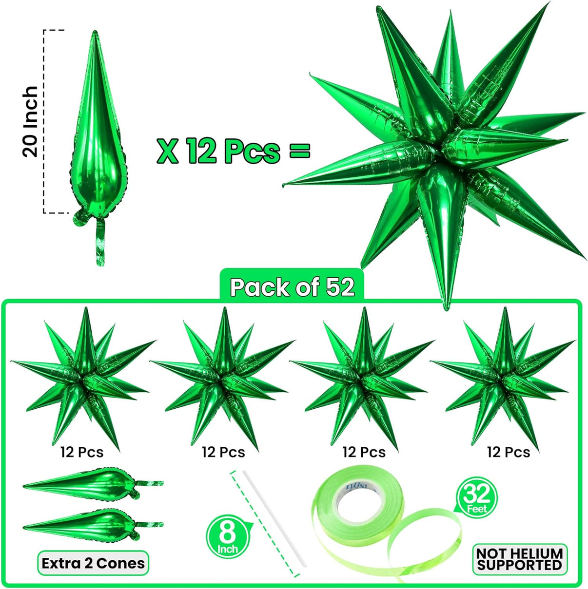 HUGE PACK OF 50 | 20x6 INCH | UNIQUE DESIGN: Looking for a unique Add-on to your Jungle Party Decorations? We have exactly what you need with these Green Star Cone Foil Balloons that are size 20x6 Inch that will be a highlight of your party. The best part is you get 12 Cones to Built a Star and 4 Star, which makes it a total Pack of 50 of these adorable Green Explosion star foil balloons are best addition to your St Patricks Day Decorations or Mardi gras balloons Decorations