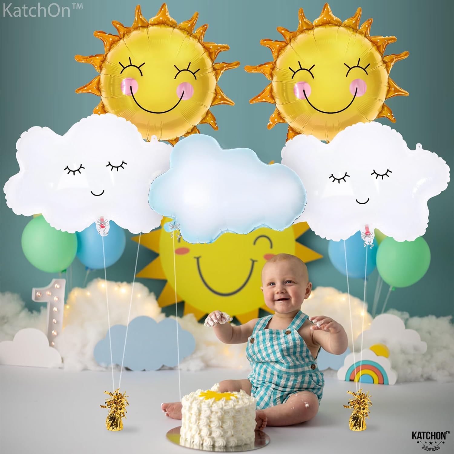 KatchOn, Big Sun and Cloud Balloons Set - 29 Inch, Pack of 5 | Foil Sun Balloon, Sunshine Party Decorations | Sunshine Baby Shower Decorations | Boho Sunshine Balloons for Sun Baby Shower Decorations