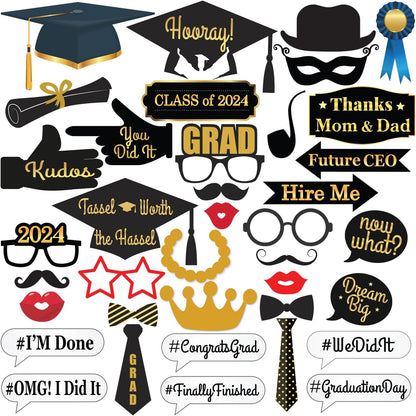 MAKE A CONFIDENT CHOICE | WE STAND BY YOUR SATISFACTION: We are very confident with the quality of our class of 2024 Photo Booth Props for we used Grade A quality black and real gold card stock material. If you were not satisfied graduation photobooth props its quality, We care about your experience and feedback. We are confident of our product photo props graduation 2024 so do not miss a chance to make your graduation party supplies more memorable.