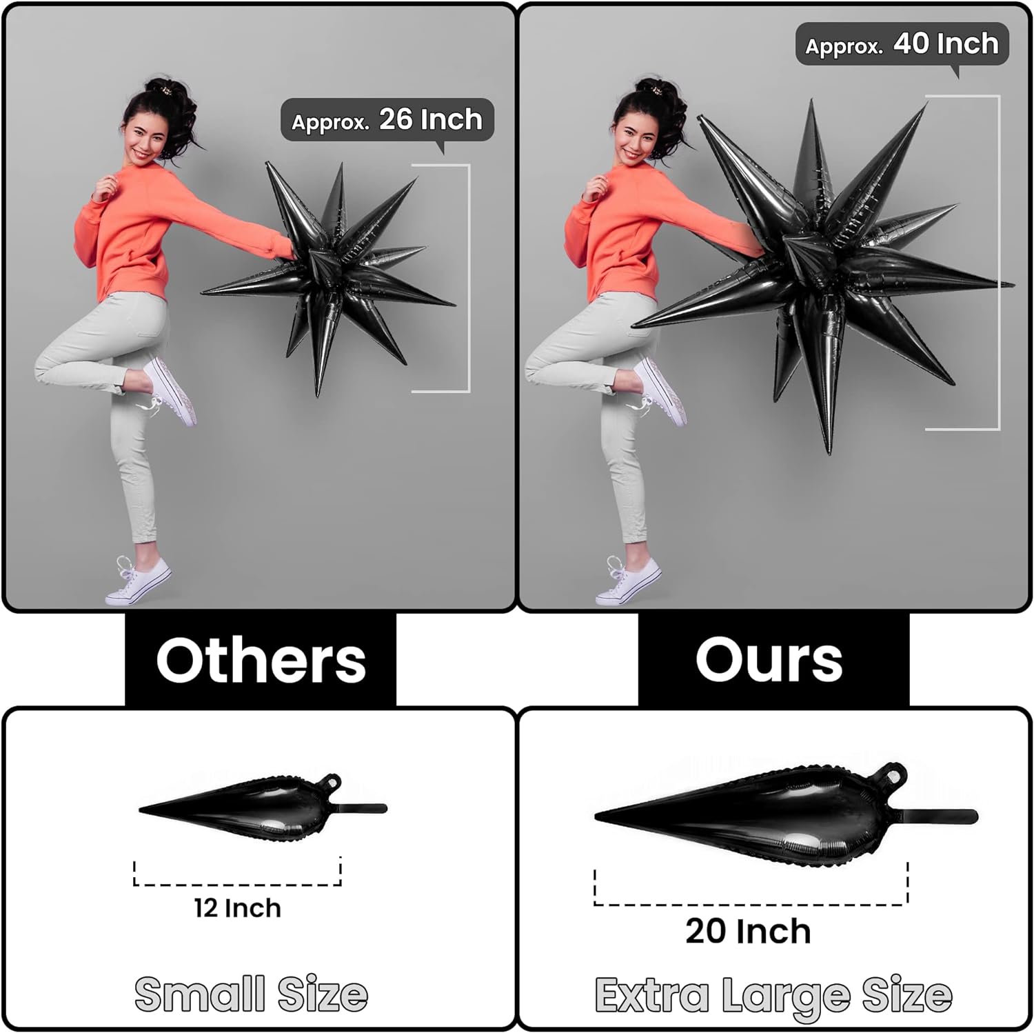 BIG - 20X6 INCH | UNIQUE DESIGN EXPLODING STAR BALLOONS METALLIC : Looking for a perfect Add-on to your party? We have exactly what you need with this Black Star Cone Foil Balloons that are Jumbo size of 20x6 Inch will be a highlight. The best part is you get 12 Cones to Built 4 Stars, which makes it total Pack of 50 of these starburst Star cone balloons. Create an perfect arch with Black foil balloons, black spiky balloons. Perfect for your black star decorations.