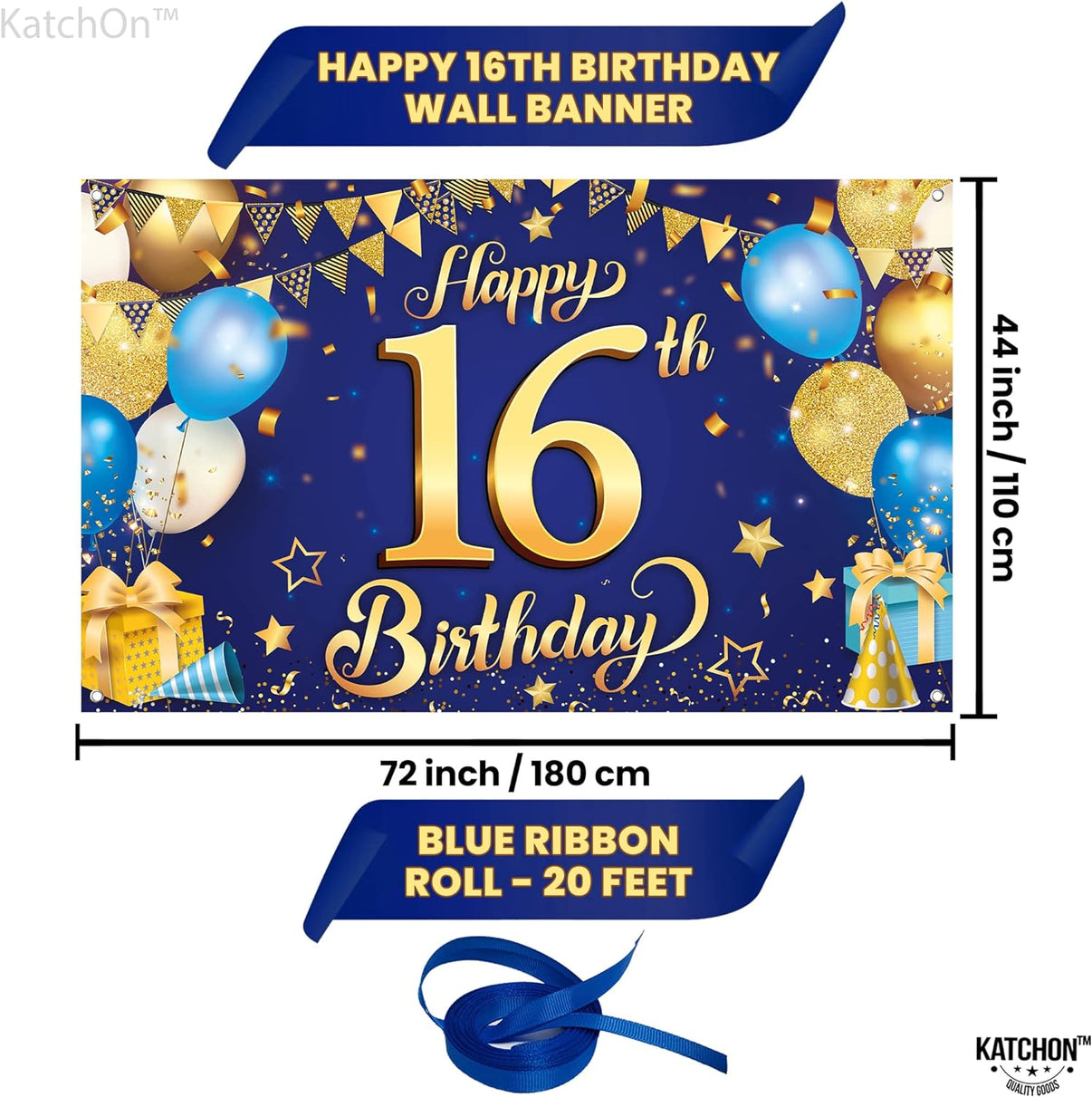 KatchOn, Blue and Gold Happy 16th Birthday Banner - XL, 72x44 Inch | Blue 16th Birthday Backdrop, 16th Birthday Party Supplies, 16 Year Old Boy Birthday Decorations, 16th Birthday Decorations for Boys