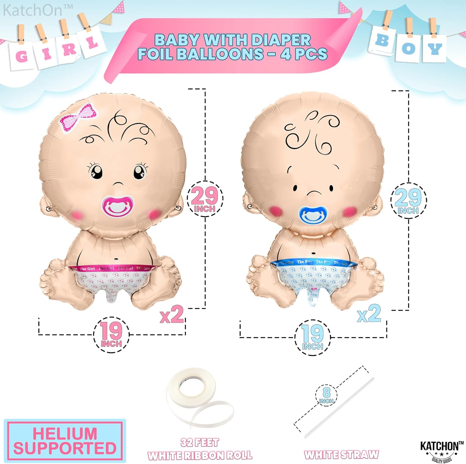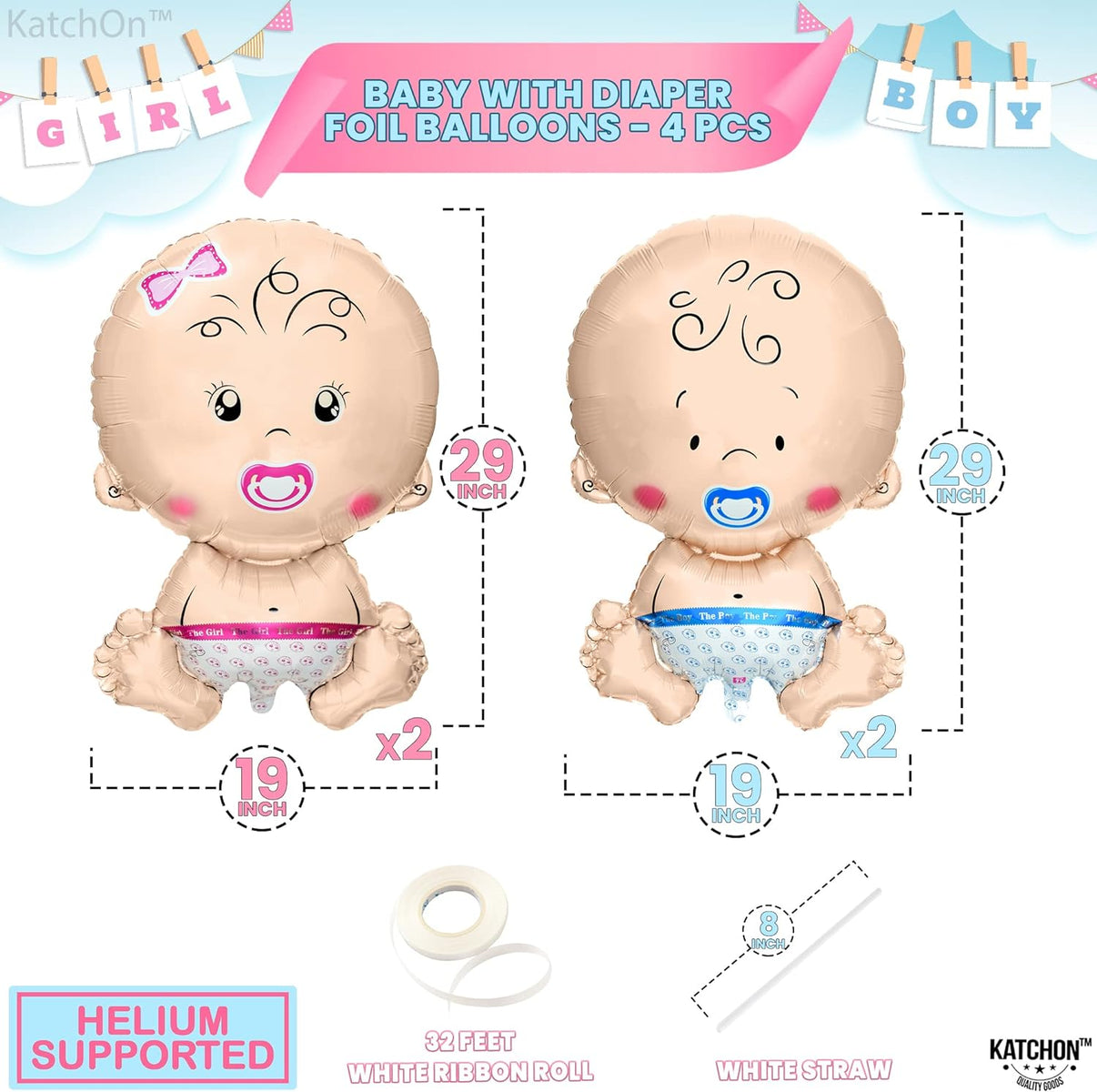 BIG - 29 INCH BABY BALLOONS | WELCOME YOUR NEW LITTLE BUNDLE OF JOY : Welcome the arrival of your little one with our adorable Xtra large baby girl and boy balloon. This pack includes both baby boy and girl shaped balloons, katchon gender reveal balloon baby for twin gender reveal decorations kit, gender reveal backdrop. Whether you choose to use balloons for gender reveal streamers or simply to announce news to family and friends, our pack is the perfect way to make the big gender balloons.