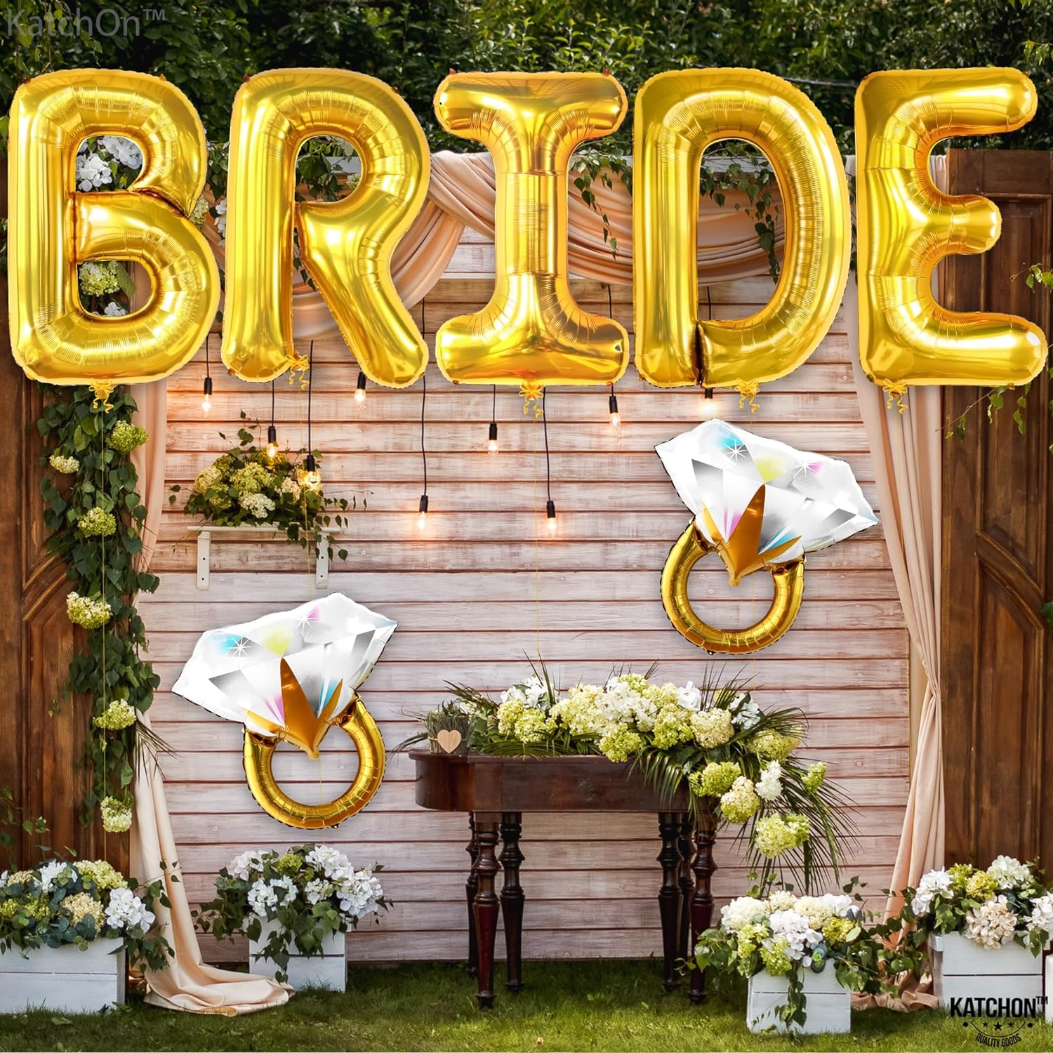 REUSABLE | STURDY BRIDAL SHOWER DECORATIONS : This Large bachlorette party bride decorations are made sturdy enough to stand the long-hour display. 40 inch Bride balloon gold set comes with gold bride balloons 40 Inch, and 32 Inch Foil diamond balloon ring metal. This bride gold balloons set can be used for wedding, engagement party decorations, bride to be gold decorations, disco bachelorette party decorations, lemon bridal shower decorations or bachelorette party decorations naughty.
