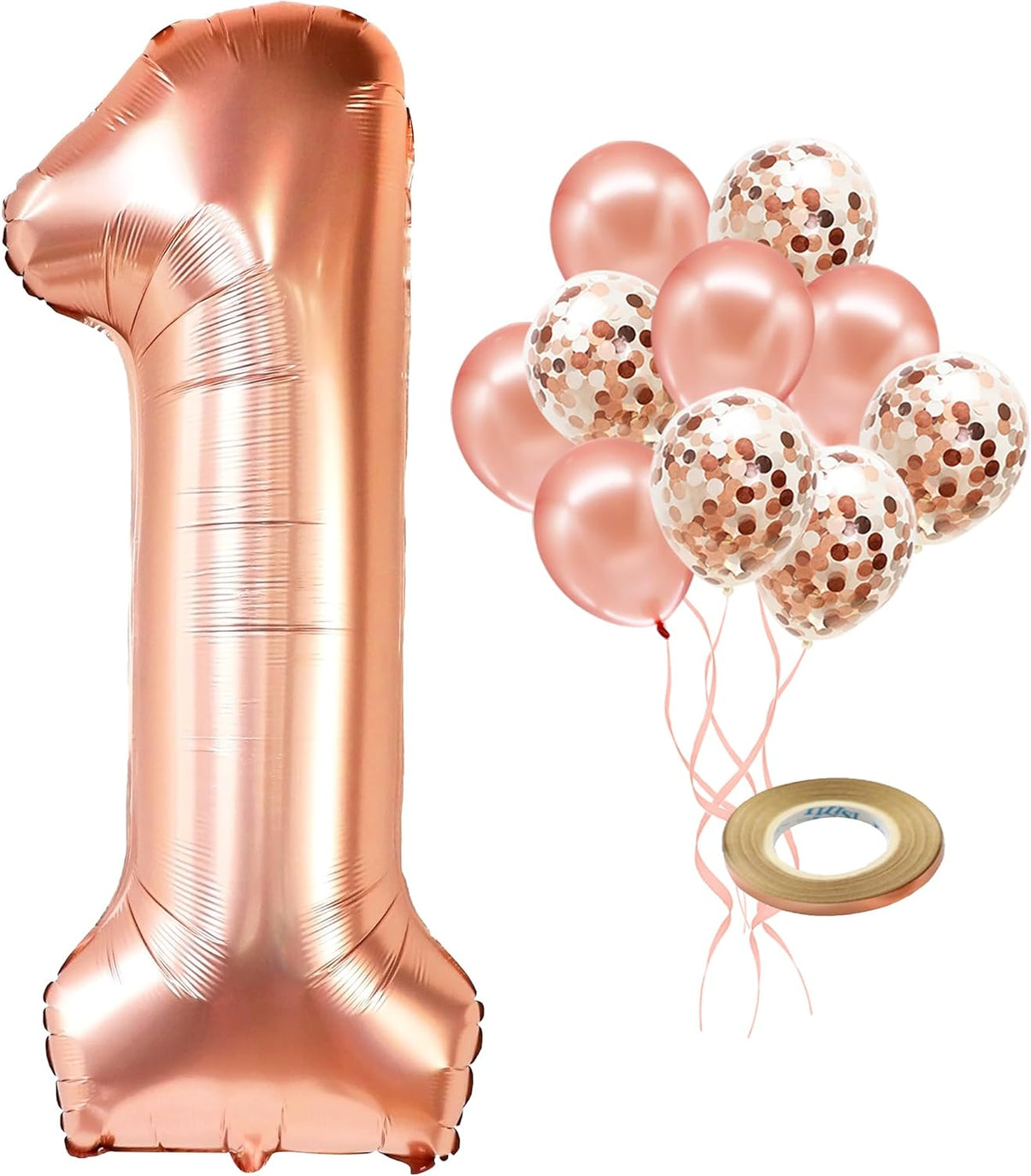 PACK OF 11 | CONFETTI BALLOONS : These first birthday decorations for girl that come with a Giant Rose Gold 1 Balloon, pack of 5 Real Rose Gold Latex Balloons & pack of 5 Rose Gold Confetti Balloons. it will complete your bridal shower decoration. Choose from numbers 0 to 9 balloons to make up any age or number for your occasion. This Rose Gold Number 1 Balloons for 1st birthday girl is decorated with more foil number balloons to create double digit age or special date.