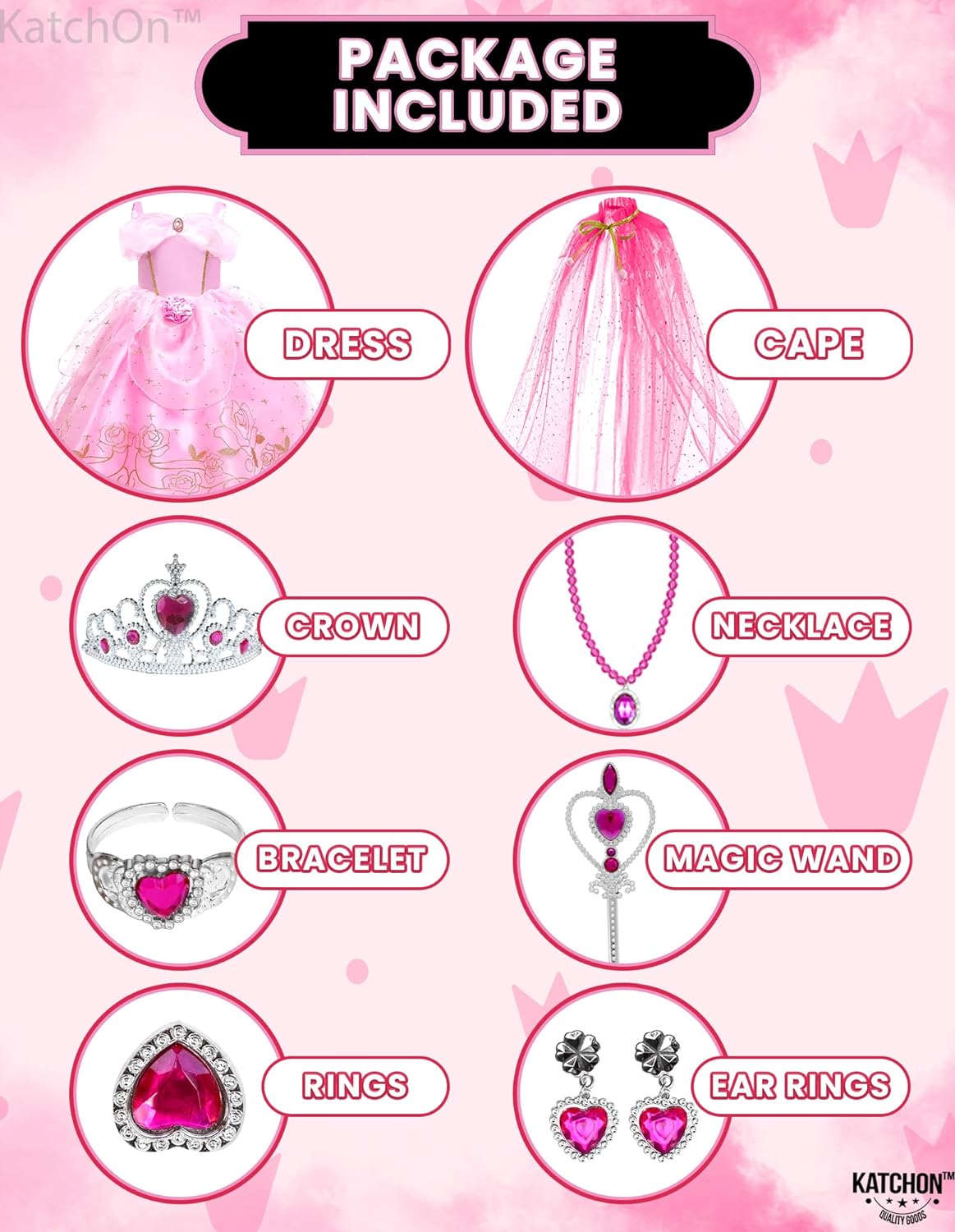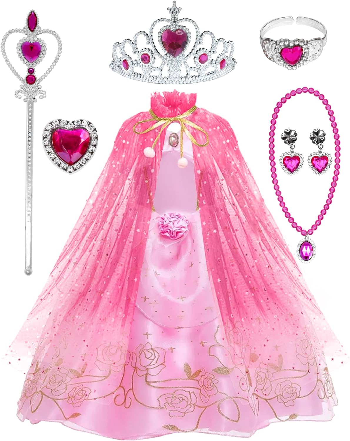 SIZE: SMALL | HALLOWEEN PRINCESS COSTUME FOR GIRLS: Every child's dreams of royalty and enchantment come true with our Pink princess dress set for girls 4-5y. Designed to capture the essence of a graceful and powerful princess, this princess costume 4-5 set includes a flowing cape, an exquisite crown, charming bracelet, shimmering ring, elegant earrings, a magical wand, and a dazzling necklace. The pink princess for girls isn't just about outfit it's about sparking creativity and imagination