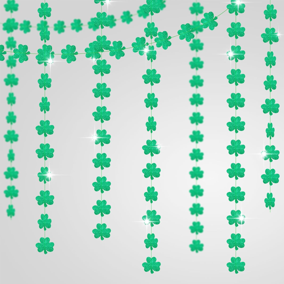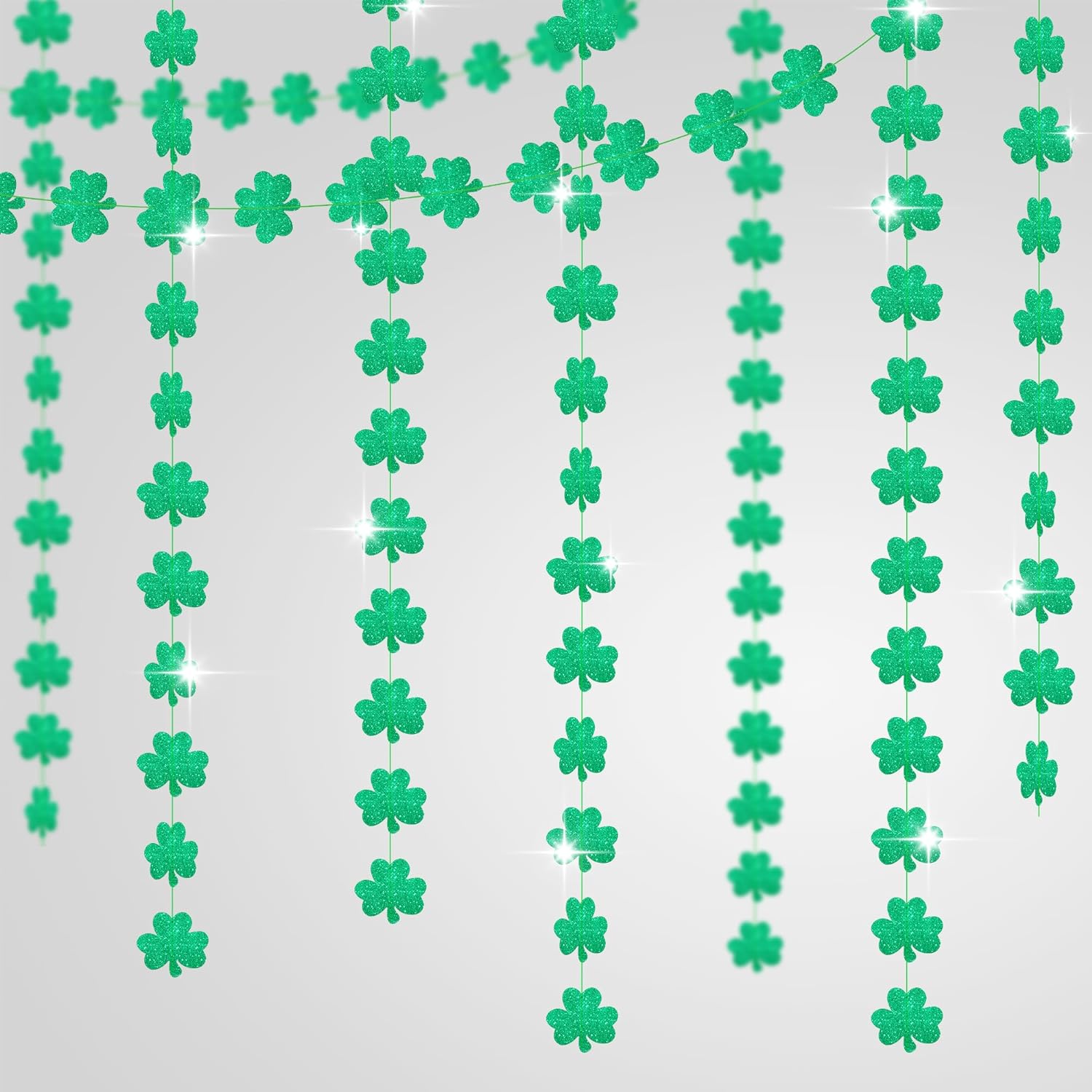 REAL GREEN GLITTER SHAMROCK GARLAND | 6 STRINGS : Bring in this glitter hanging shamrocks garland that are designed in vibrant green color. This fresh green symbolizes good luck, hope, fortune, health and fully display of the Irish festival atmosphere. Made with glitter shamrock garland designs and have been sewn together with green thread. Package includes 6 individual strings not just one garland. This st patricks day garland for irish decorations.