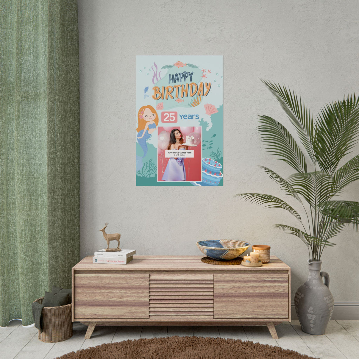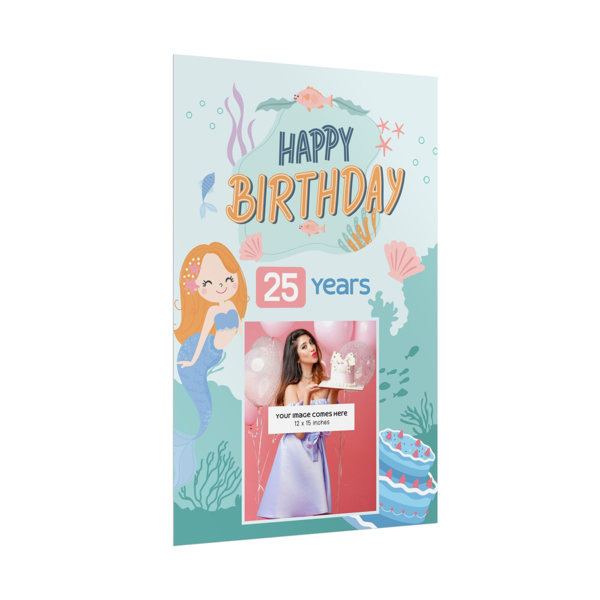Celebrate a milestone with a rolled poster that brings a playful, underwater birthday scene to life. Soft seafoam backgrounds and cheerful mermaid illustrations wrap around bold, hand-lettered “Happy Birthday” text, while a customizable photo window and age badge put the honoree front and center. The overall mood is whimsical and joyful — a little bit magical, like a seaside party where laughter drifts on the salt air. Hung above a dessert table or leaned against a wall, this poster acts as the backdrop to memories, framing the birthday person and setting the tone for an intimate, colorful celebration.