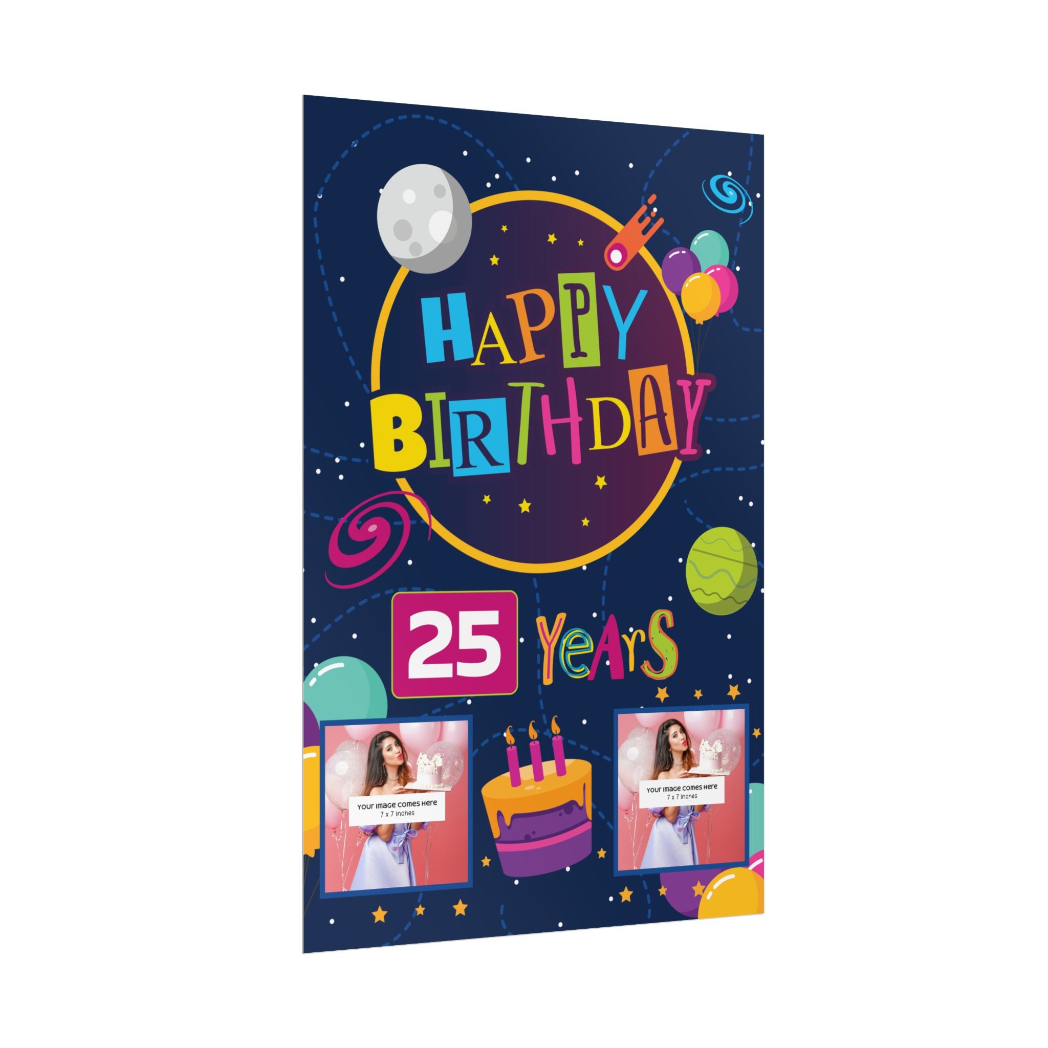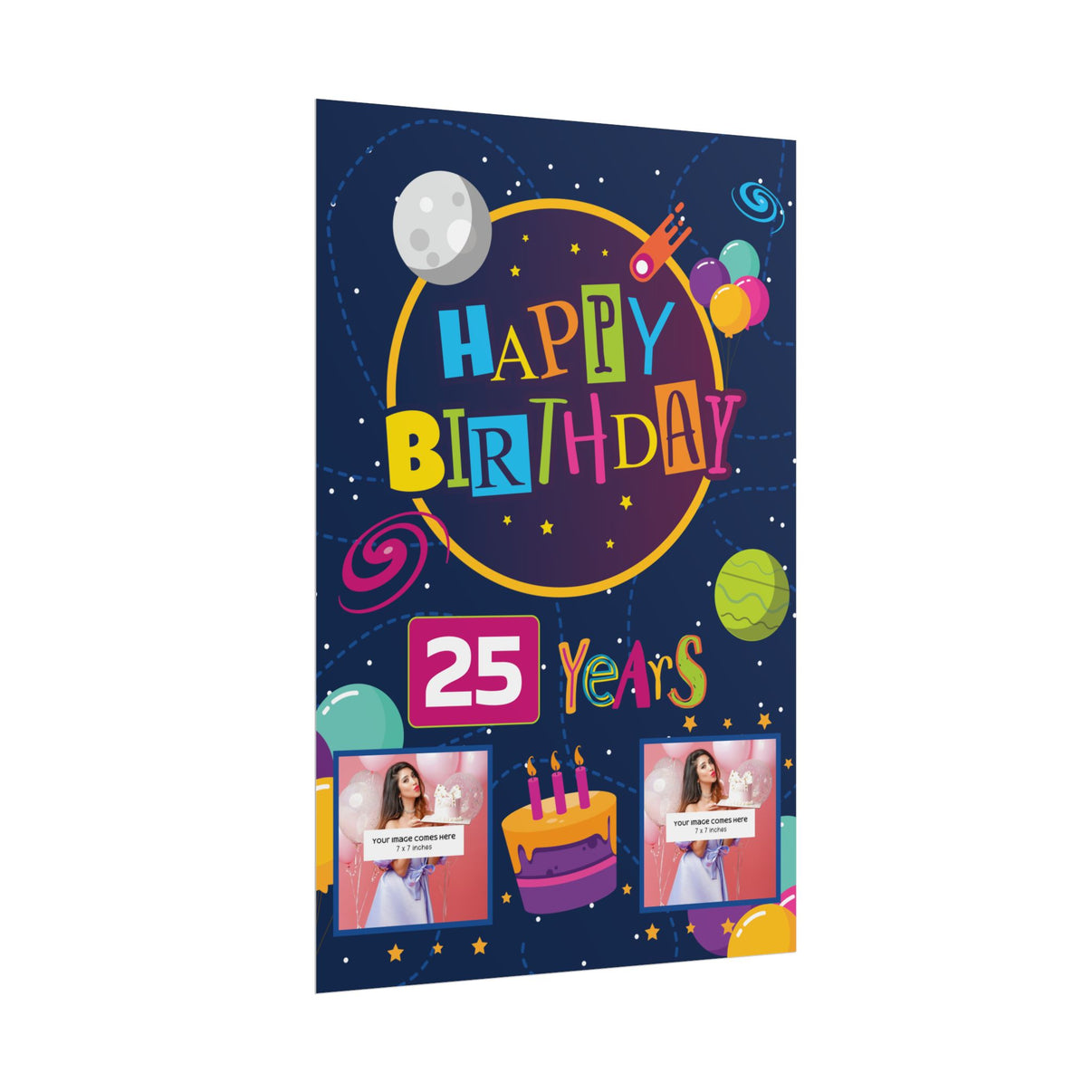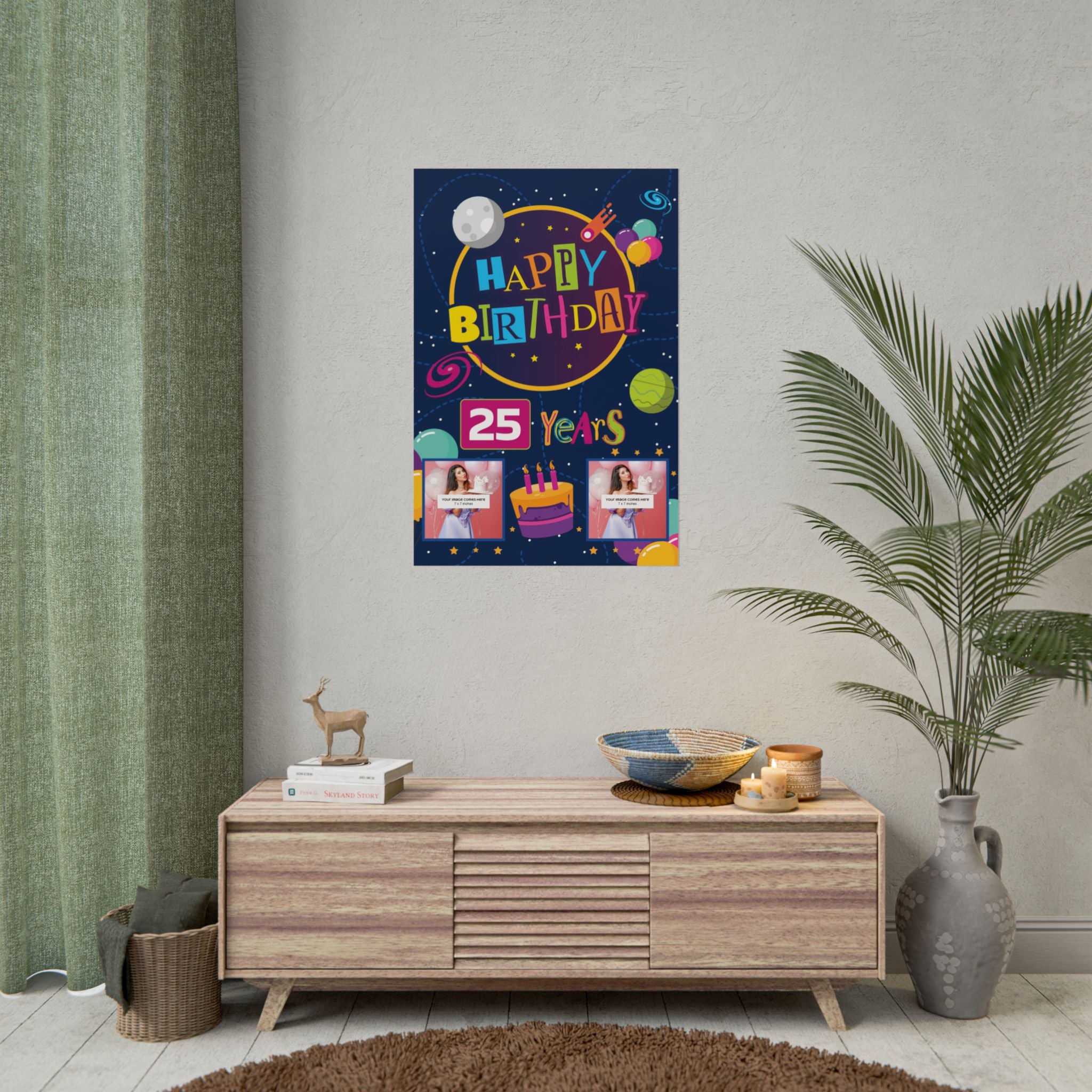 Celebrate a milestone with color and whimsy. This rolled poster brings a playful, cosmic birthday scene into any room — bright planets, confetti stars, and a cheerful “Happy Birthday” headline surround a bold age plaque and space for two photos. Printed on archival-quality or photo-grade paper, the image stays vivid under regular light and keeps its textured, gallery feel. Hang it in a party space, roll it into a keepsake tube afterward, or display it as a fun reminder of a joyful celebration.