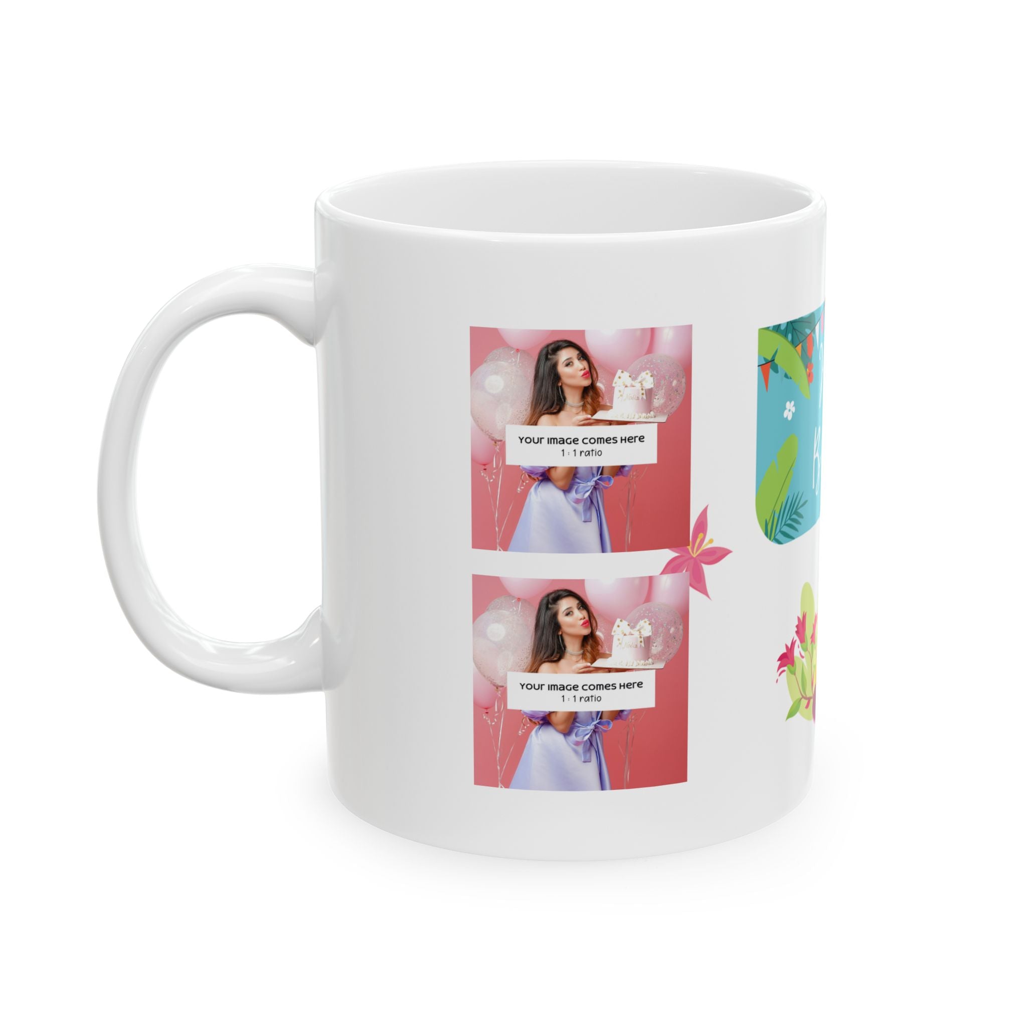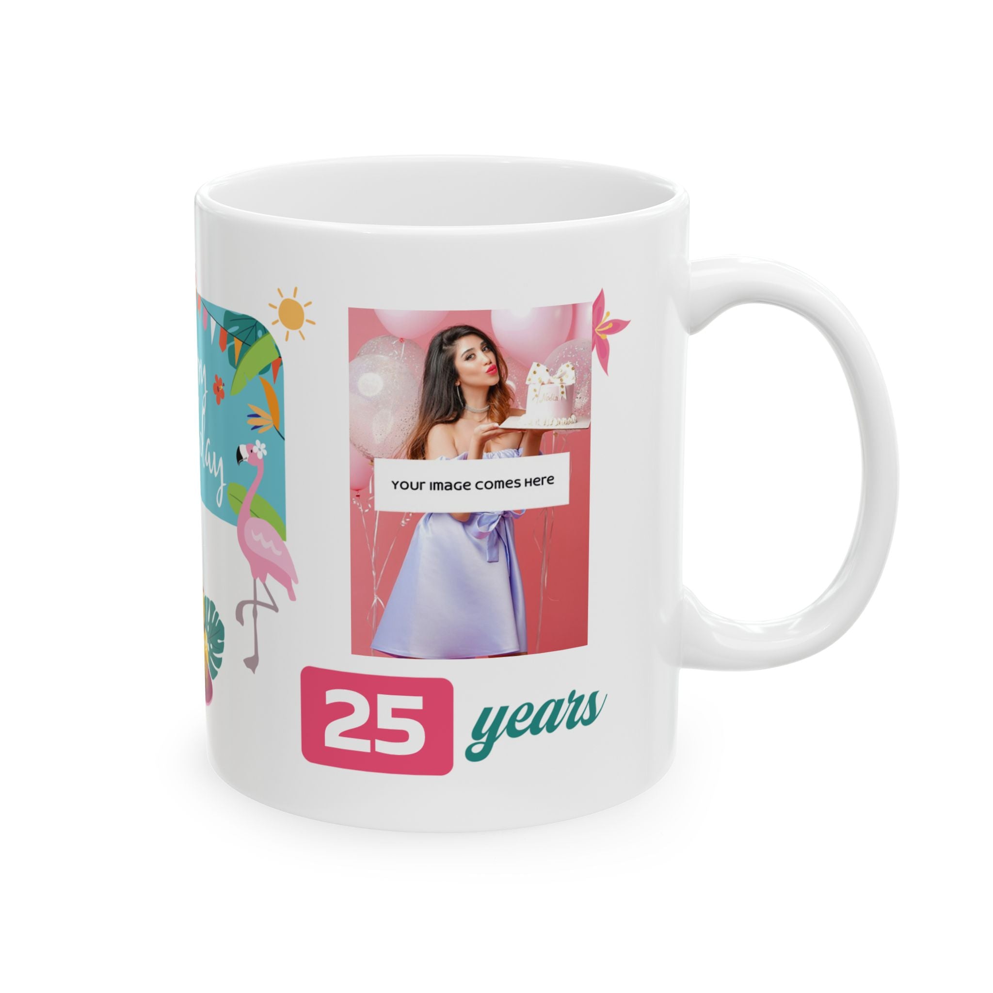 This glossy ceramic mug brings a burst of celebration to every sip. Bright, cheerful artwork wraps around the white surface—tropical florals, a playful flamingo, and a hand-lettered "Happy Birthday" banner that reads like a small party in your hands. The comfortable C-handle and smooth finish make it an easy companion for morning coffee or afternoon tea. Built to stand up to daily use, the mug’s vibrant print stays crisp through the microwave and dishwasher, and the lead- and BPA-free ceramic means you can enjoy it worry-free. Choose between two sizes to match the way you drink: a compact 11oz or a roomier 15oz for those who like a little extra.