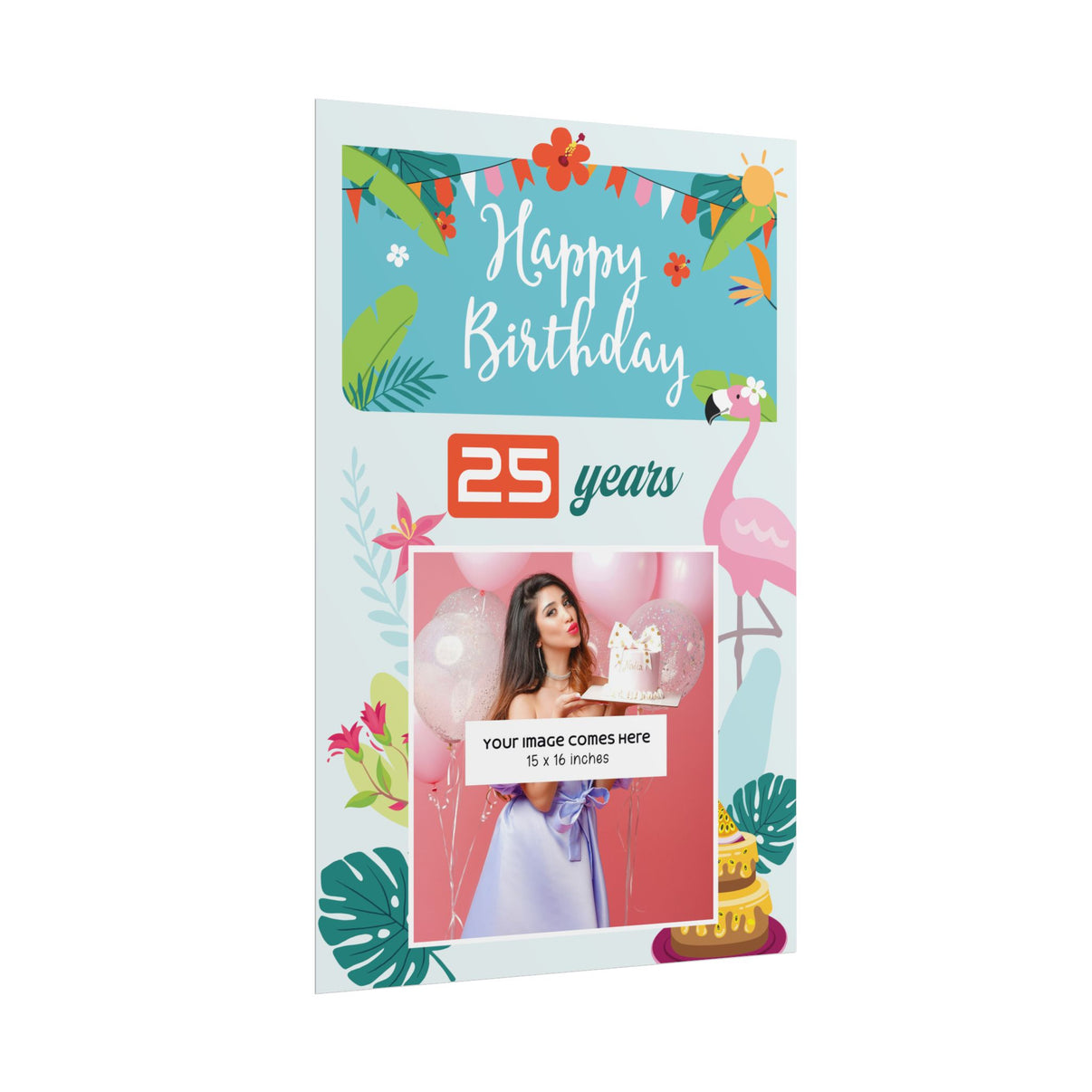 Celebrate a milestone with a vibrant rolled poster that brings a sunny, tropical birthday vibe to any space. Bright giclée inks capture every hue of the celebratory design — flamingos, lush leaves, confetti banners and a cheerful “Happy Birthday” header — while a customizable photo area and age marker let you personalize the piece for the guest of honor. Choose from fine art, matte, or semi-glossy paper finishes to match your display style: textured archival paper for a gallery feel, satin semi-gloss for punchy color and sharp detail, or a softer matte for a subtle, low-glare look. Ships rolled for safe delivery, ready to frame or hang and made with long-lasting materials that keep colors lively through regular sunlight exposure.