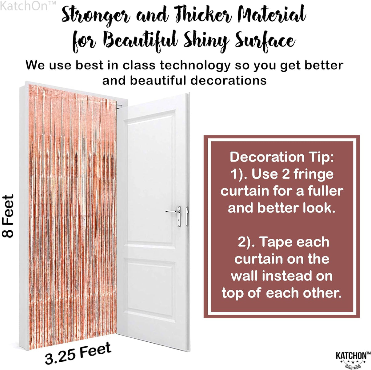 EASY TO ASSEMBLE - This Rose Gold Tinsel backdrop comes with adhesive strip at the back so it would be very easy to hang in your wall! Plus this beautiful pack of 2 rose gold fringe curtain could stay hanging for days! Isn’t great? Also the cut of the tinsels is pretty wide, it’ll will not easy strip down! It will surely transform your home into a shining and glimmering bachelorette streamers birthday decorations. Use this katchon rose gold fringe curtain for 40th birthday decorations women.