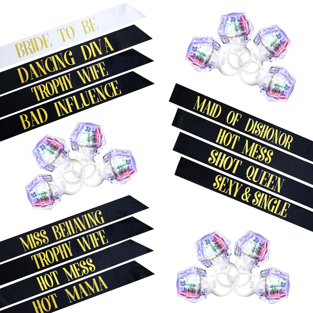 Looking to throw a bachelorette party for the bride to be? Start with our White and Black bachelorette party sash set and LED flashing rings