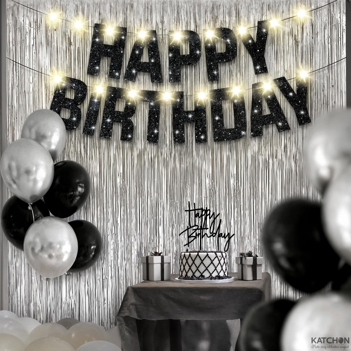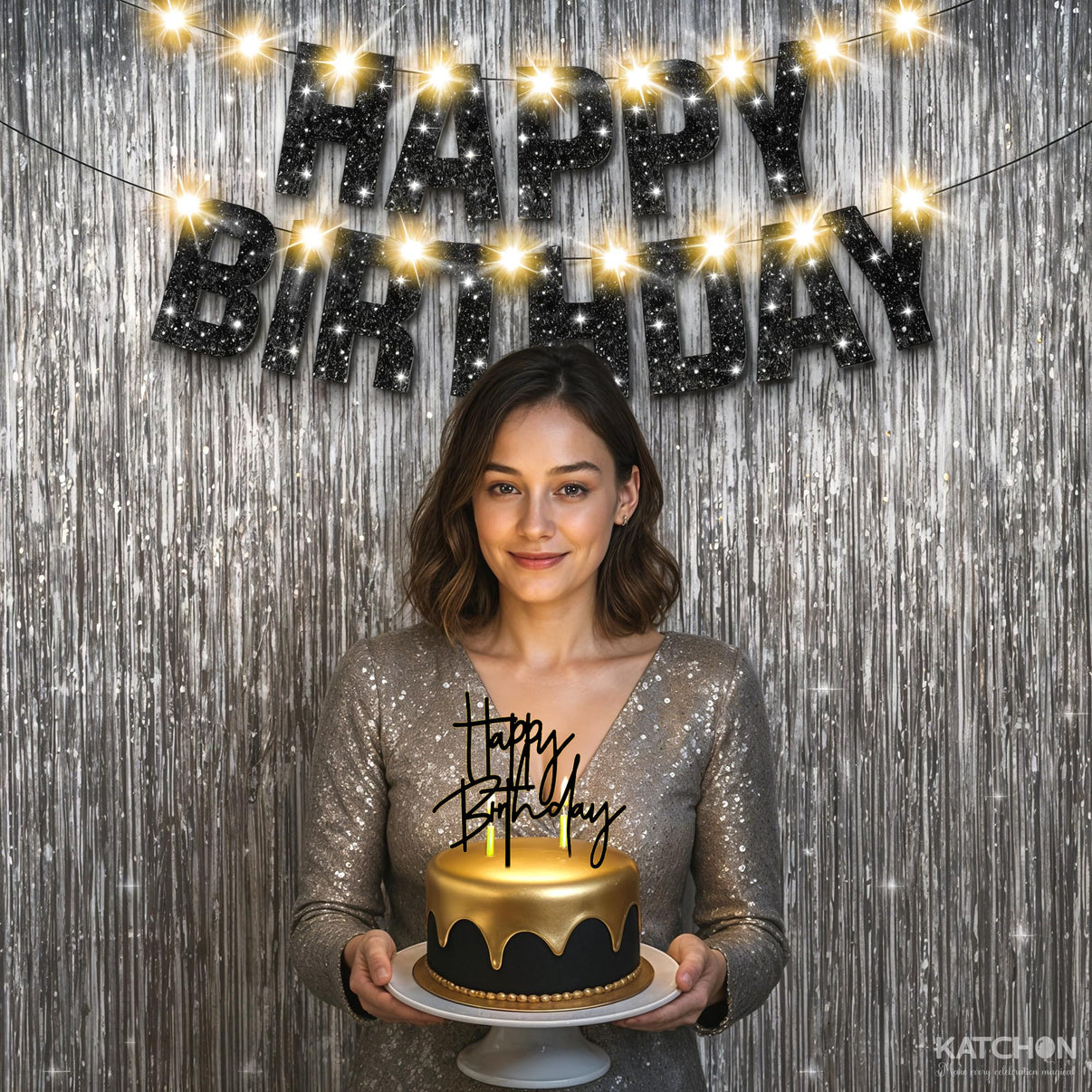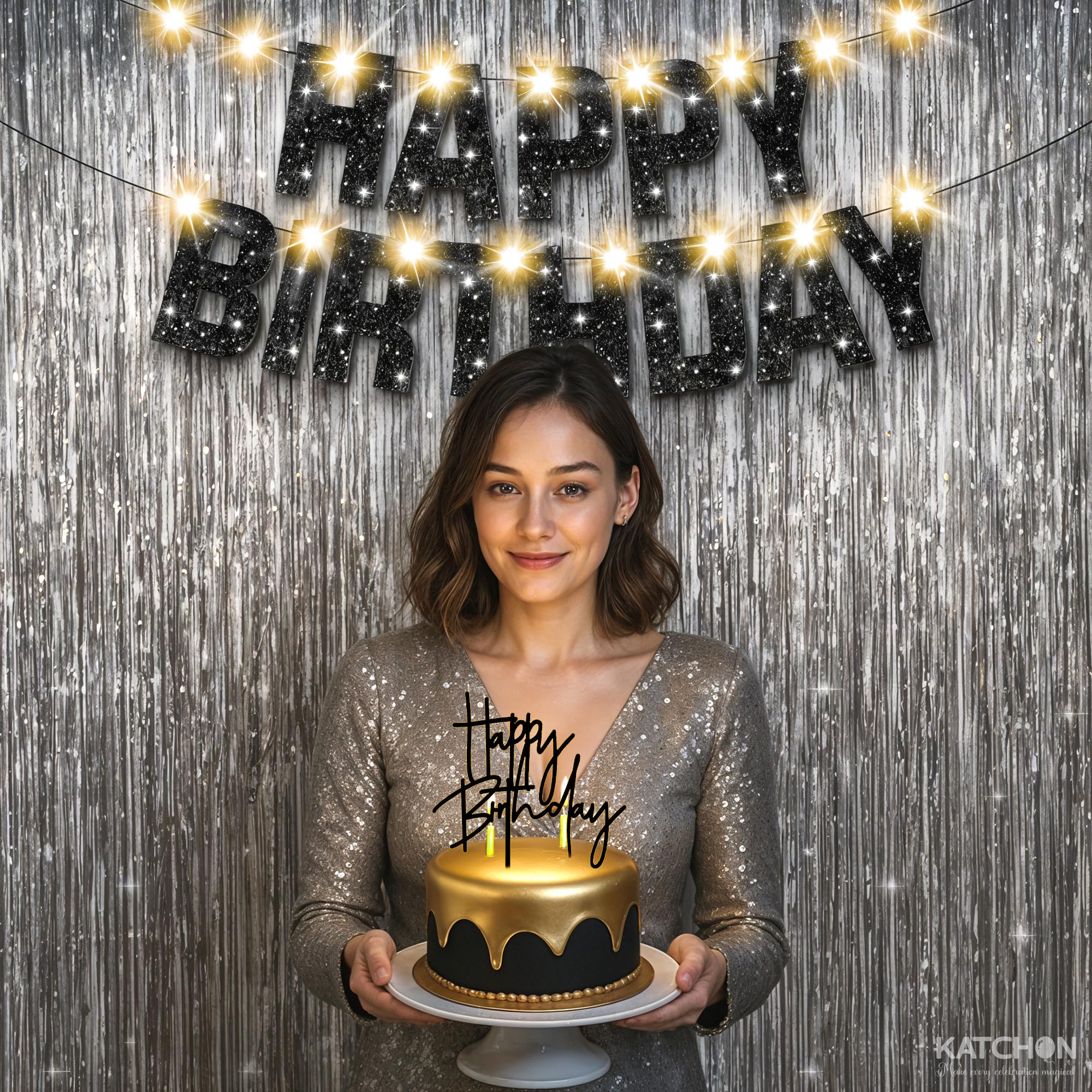 Complete Happy Birthday Decorations Set Make your celebration shine with this premium pack of 5. It includes 1 Glitter Happy Birthday Banner (10ft, letters 6), 2 Silver Foil Fringe Backdrops (6.5ft × 3.2ft), 1 Glitter Happy Birthday Cake Topper (5.3), and 1 Warm LED Happy Birthday Light Up Sign (10ft). This all-in-one kit is perfect for black happy birthday banner, happy birthday sign for backdrop, or stylish silver and black birthday decorations, happy birthday banner for women, happy birthday banners .