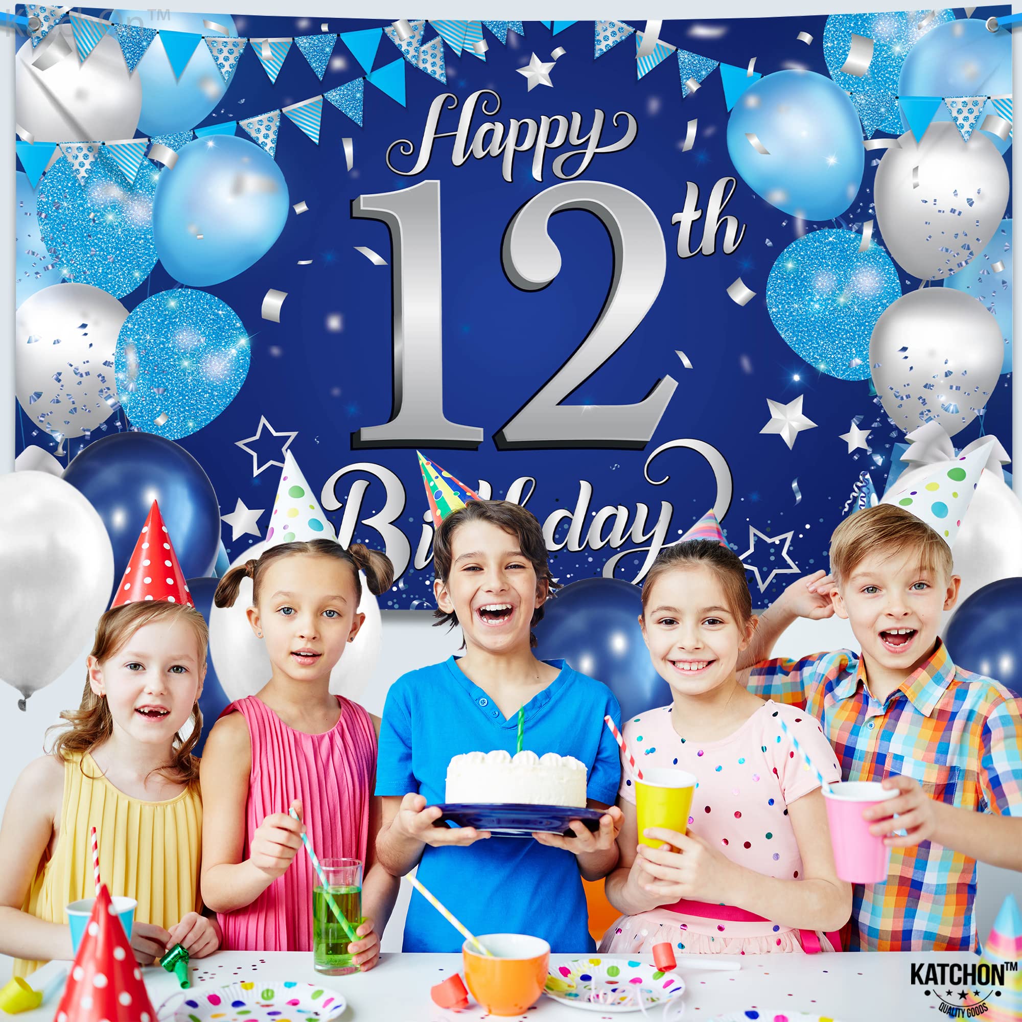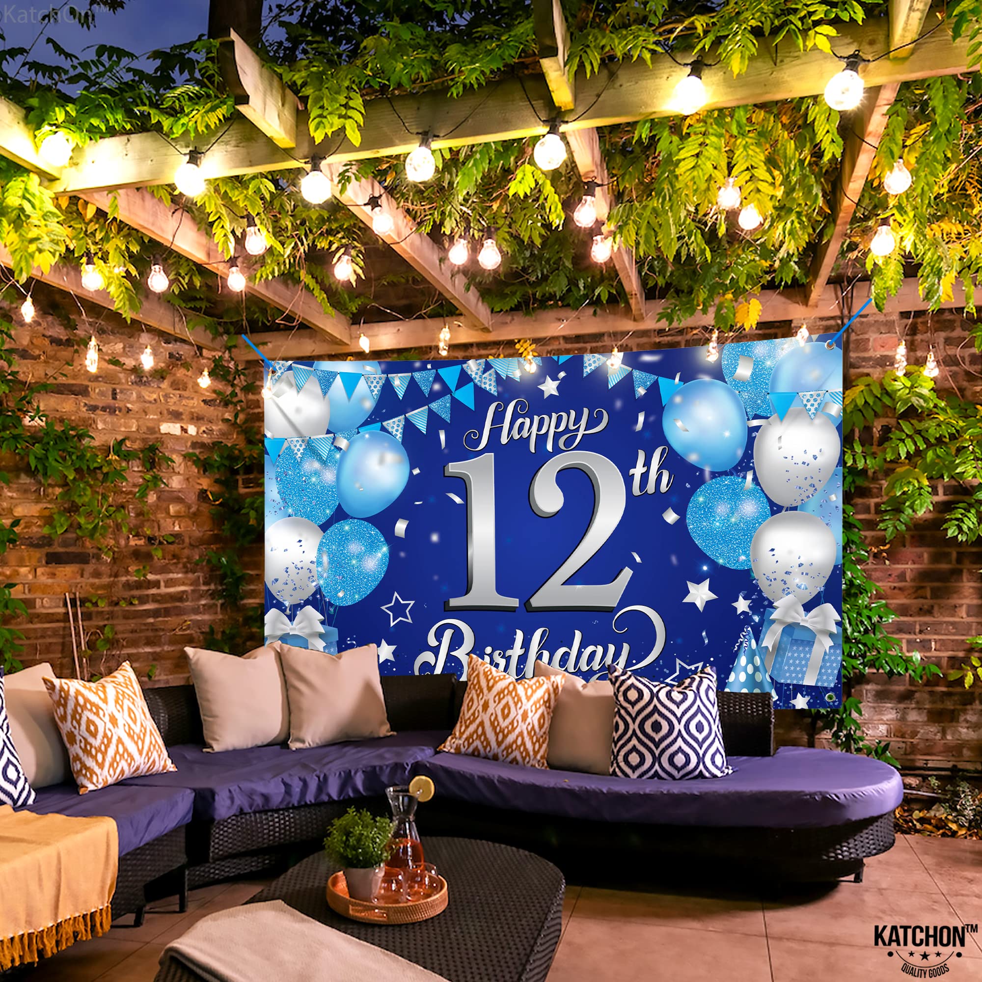KatchOn, Blue Happy 12th Birthday Banner - 72x44 Inch, Big | Blue and Silver Happy Birthday Backdrop | Birthday Decorations for Men | Happy Bday Banner for 12th Birthday Party Decorations