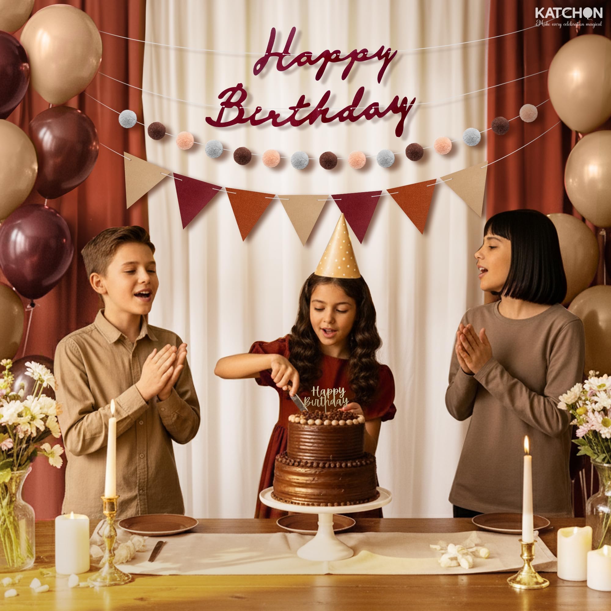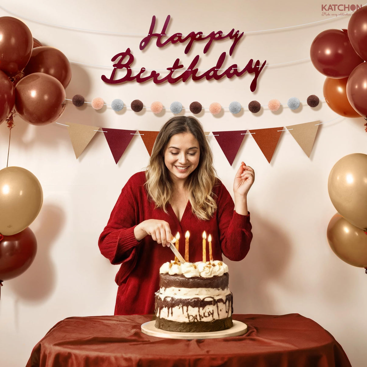 Planning a birthday party? Make your celebration stand out with our elegant Burgundy Felt Happy Birthday Banner Set. Designed with stylish cursive lettering, soft pom pom garland, and a rustic triangle flag banner, this set adds charm, warmth, and elegance to your party decor. Whether you are hosting at home, in a hall, or outdoors, these decorations will transform any space into a festive and memorable setup!