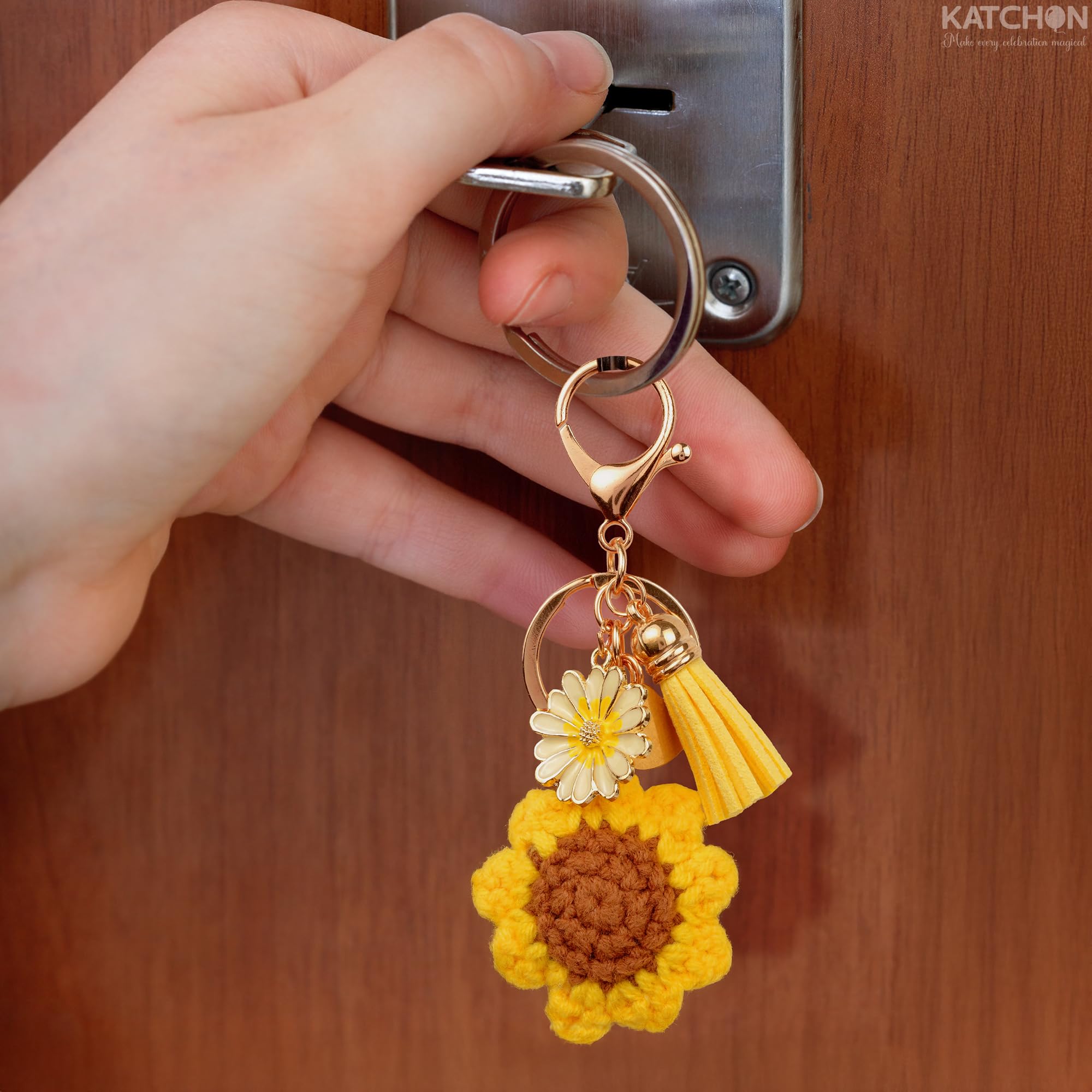 This sunflower keychain includes a handcrafted crochet sunflower, a detailed daisy charm, a cheerful yellow tassel, and a strong gold-tone lobster clasp that attaches easily to any item. Whether you're looking for a cute keychain for your purse or a keychain charm for your wallet or car keys, this piece delivers style and versatility.