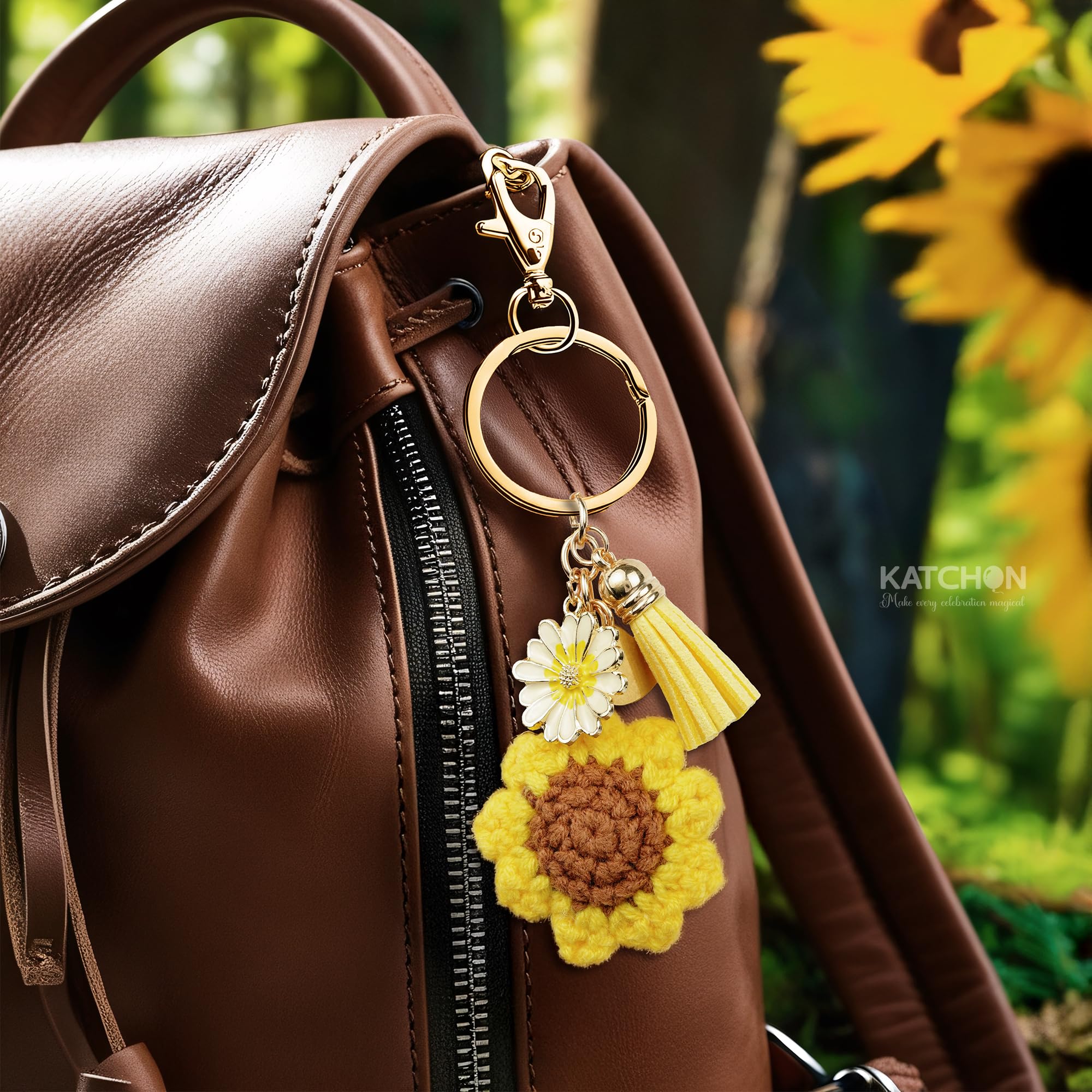 At just 4 inches long, this sunflower keychain fits effortlessly on handbags, backpacks, totes, key rings, and more. Its the perfect bag charm to express your sunny personality or complement a casual, boho-chic look. Whether you're looking to decorate a keychain wallet or accessorize your tote, this bag charm brings a soft, creative flair.