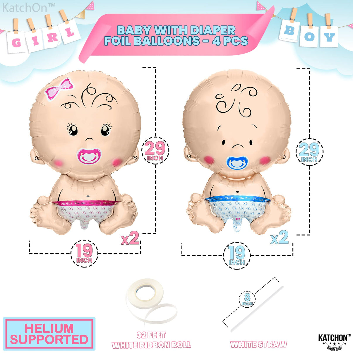- Large baby girl Balloon - 28 Inch, Pack of 2 - Large Baby Boy Balloon - 28Inch, Pack of 2 - White Ribbon and 1 Straw to inflate