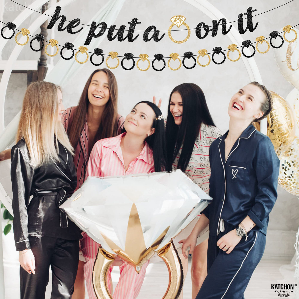 Celebrate the moment of She Said Yes because that's what she said to your best friend with this gold glitter bride to be banner bachelorette party decorations. With the stress of planning the big day, you don't need to worry about the bachelorette party as its time to let your hair down and have fun and we make it easier for you with these he put a ring on it sign banner for the engagement party!!!