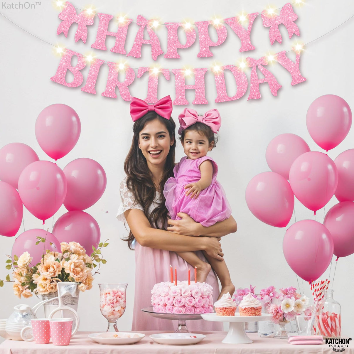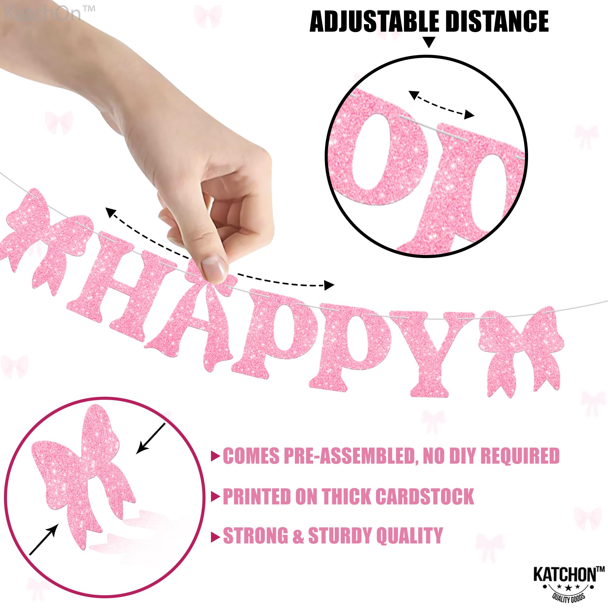 KatchOn, Pink Glitter Happy Birthday Banner with Lights - No DIY, 10 Feet | Happy Birthday Bow Banner | Birthday Decorations for Women, Girls | Pink Bow Birthday Decorations