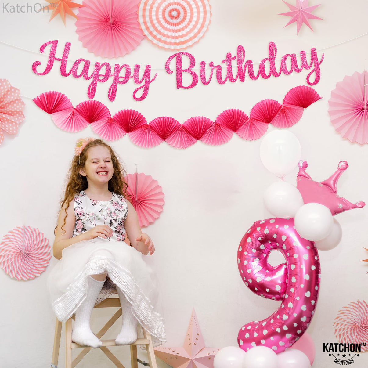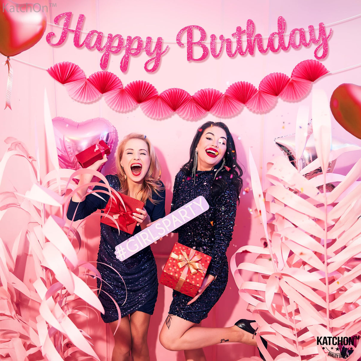 KatchOn, Pre Strung Pink Cursive Happy Birthday Banner with Paper Fan Garland Set | Happy Birthday Sign, Pink Paper Banner for Happy Birthday Decorations | Hot Pink Happy Birthday Party Decor for Girl