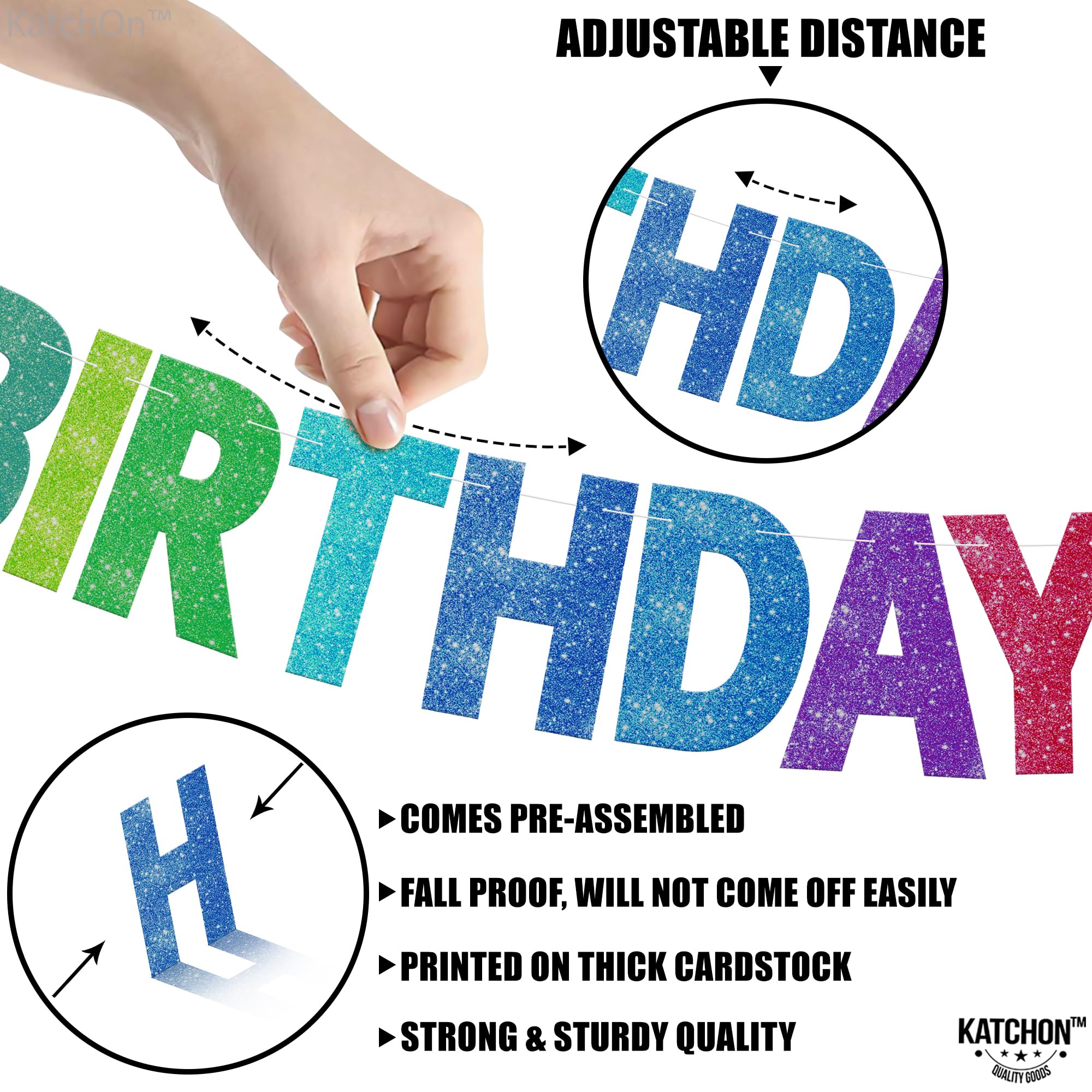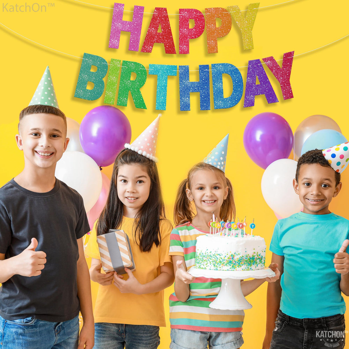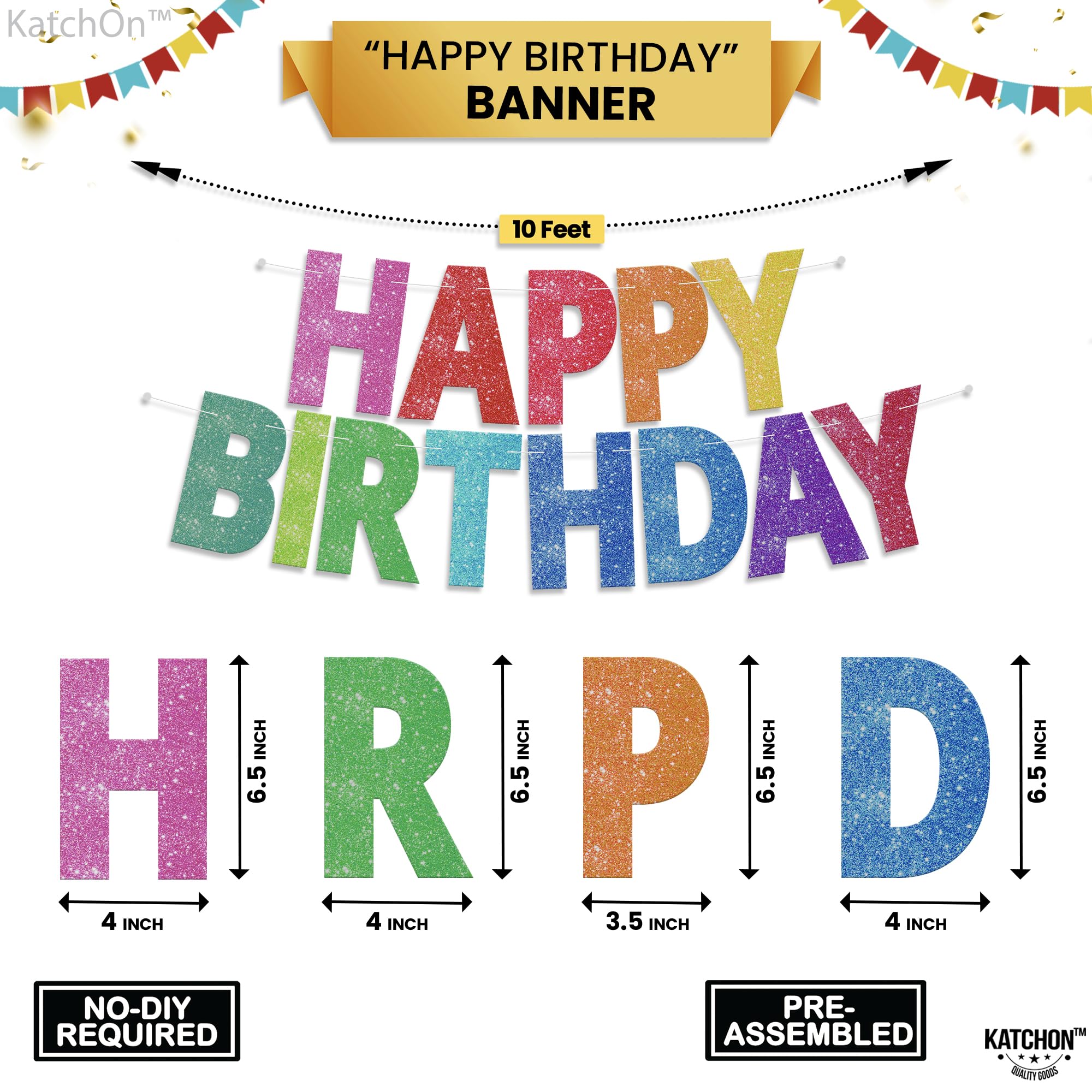 1) Large rainbow happy birthday banner - Glitter, 10 Feet, Rainbow 2) Material - Sturdy Cardstock 3) Gold Foil Print Happy Birthday Pennant Size - 8 x 6 Inch