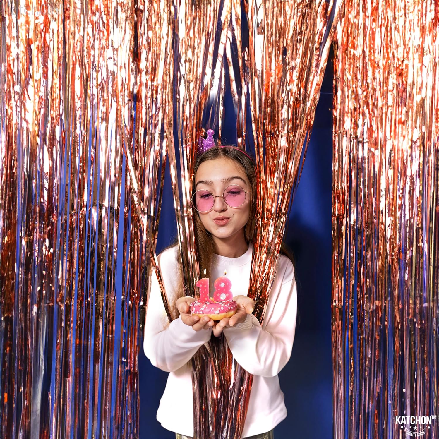 Rose gold foil curtain backdrop for rose gold birthday decorations 21st