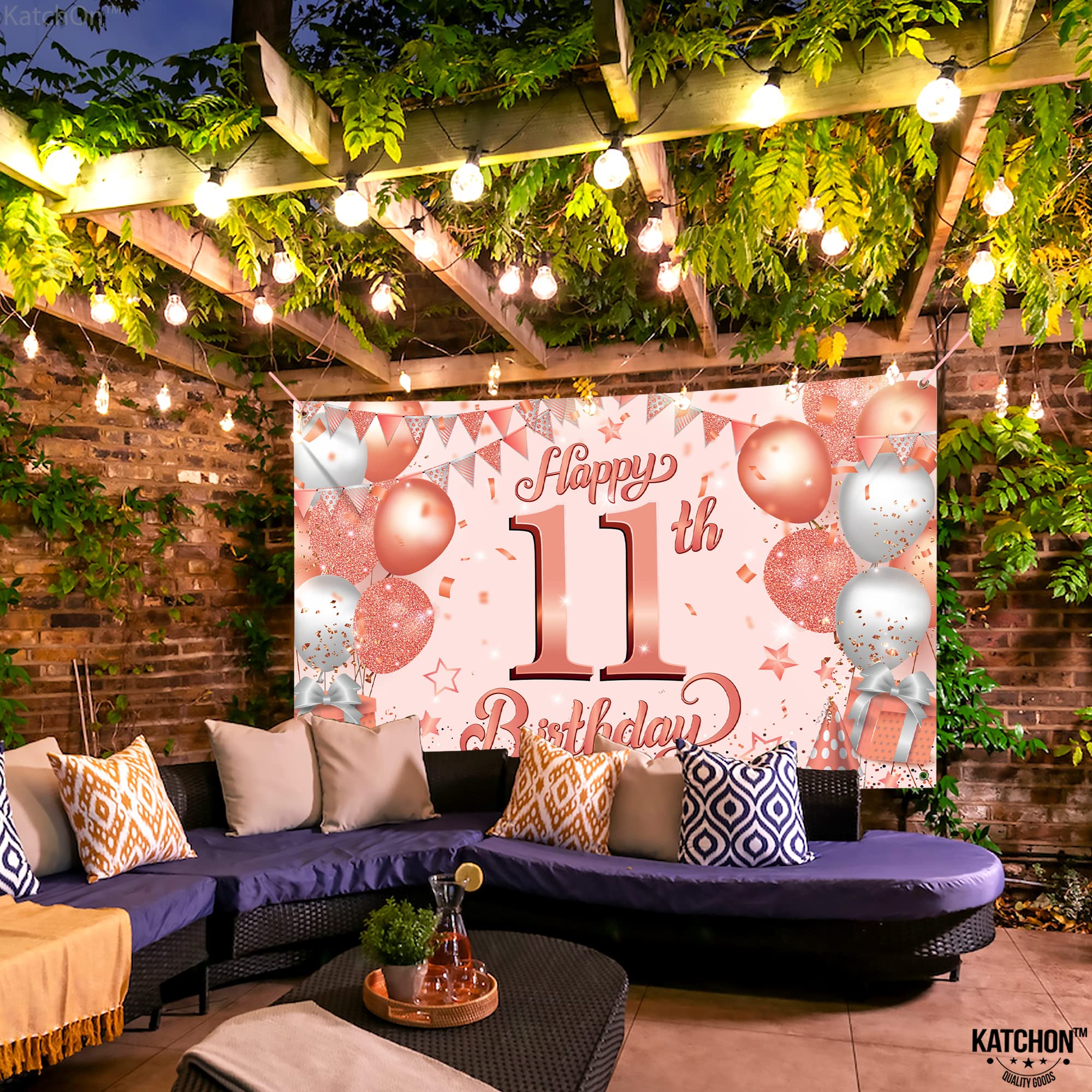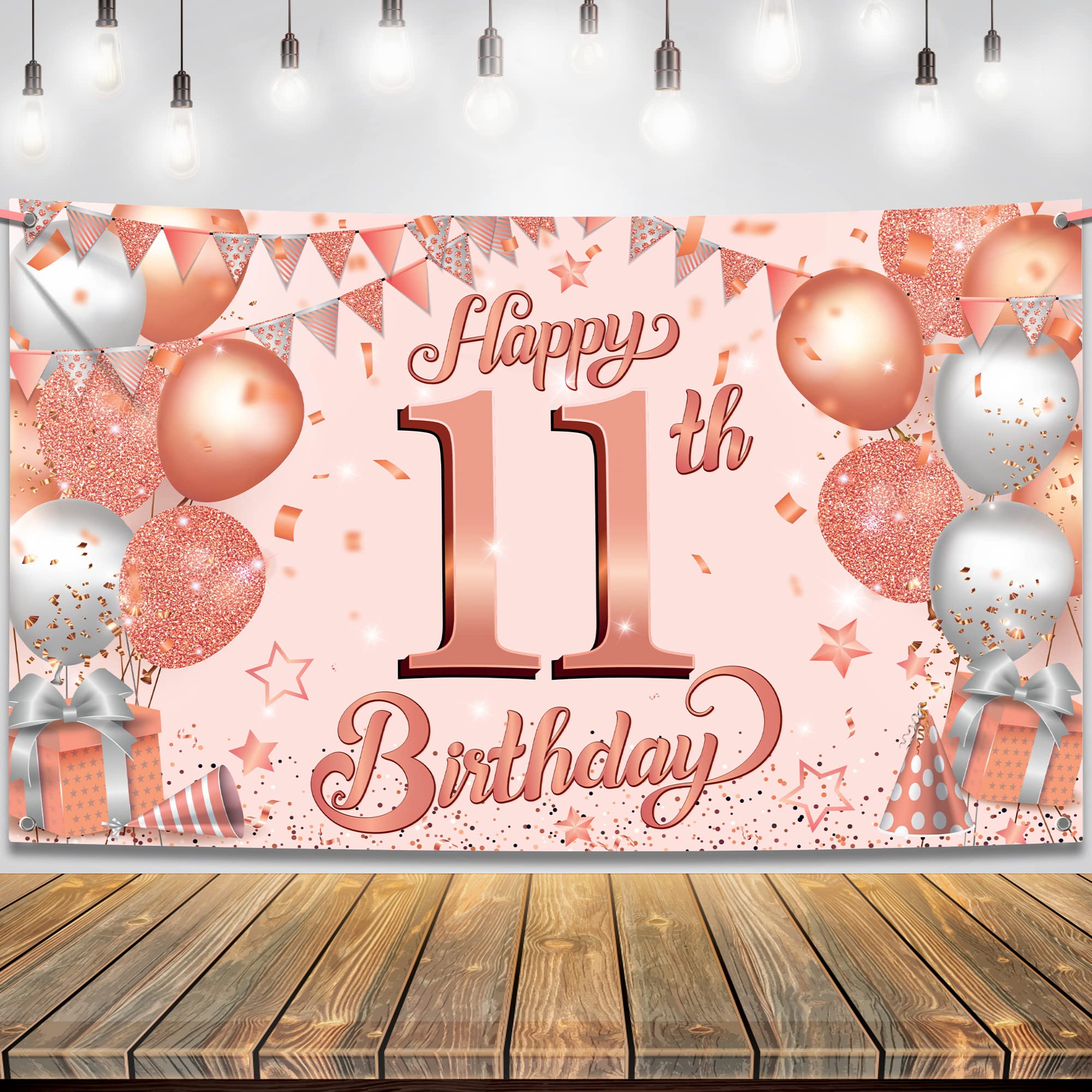 KatchOn, Rose Gold Happy 11th Birthday Banner - Large, 72 x 44 Inch | Rose Gold Happy 11th Birthday Backdrop for Girls | Happy 11th Birthday Decorations for Girls | 11 Year Old Birthday Decorations