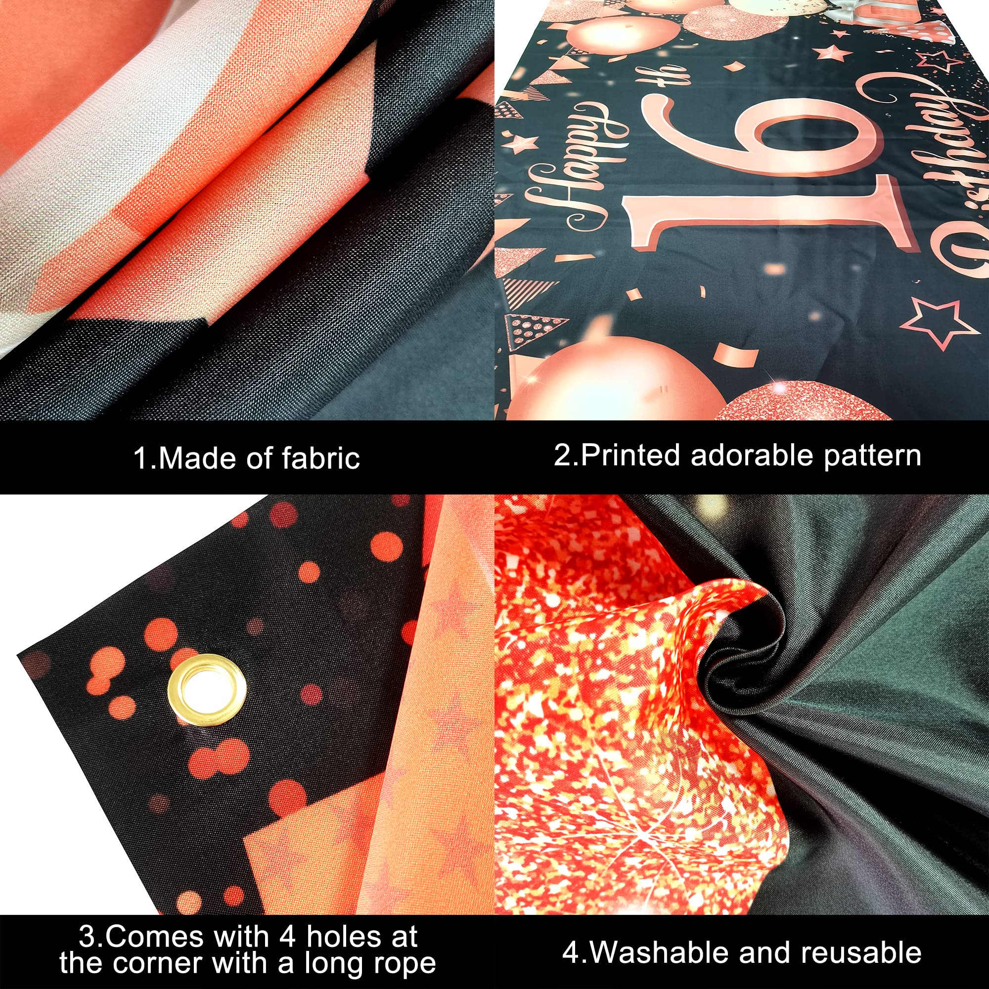 Looking for an 16th happy birthday decorations for boy or girl? Then this Black and rose gold 16th happy birthday backdrop is exactly what you need. Add a luxurious effect to your birthday celebrations with this sturdy 16 Happy Birthday Backdrop Banner. Have a magnificent and splendid birthday party with this 16 happy birthday banner. Match your rose gold birthday decorations with these festive yet classy backdrop birthday Sign. This black and rose gold birthday backdrop for happy 16th birthday decorations is beautifully crafted on sturdy Cloth Fabric material. What You Will Get: 1) Material: Cloth Fabric Material 2) Rose Gold 16th Happy Birthday Banner : 72x44 Inch 3) Black Ribbon - 20 Feet Product Descriptions : 1). This Happy birthday backdrop banner is reusable thanks to its very sturdy Cloth Fabric material with the rings implanted on each end to hold it securely 2). The black birthday banner has Material of Grade 'A' quality, best to withstand harsh weather conditions, also water resistance Suggested uses: - 16th Happy birthday banner rose gold, 16th birthday decorations for 16 birthday decorations for girls- Photo booth Backdrops for 16th birthday decorations for girls, - 16 happy birthday banner rose gold - Black and rose gold backdrop for birthday - Happy Birthday Banner for boy and girl's Birthday - 16 birthday banner, sweet 16 backdrop for pictures, rose gold sweet 16 birthday rose gold sweet 16 birthday decorations- 16th birthday decorations for girls - 16th birthday decorations girl - 16th birthday decorations boy - Vibrant entrance doorway for 16th birthday decorations - 16th birthday decorations for her - 16th birthday decorations for boy - Rose Gold happy birthday sign for large Happy birthday backdrop for girl - Outdoor birthday sign for 16th birthday decorations for girl - Happy Birthday Sign Decorations for 16th birthday decoration birthday decorations for women sweet 16 decorations for girls pink sweet 16 party decorations 16 th birthday decorations for girls