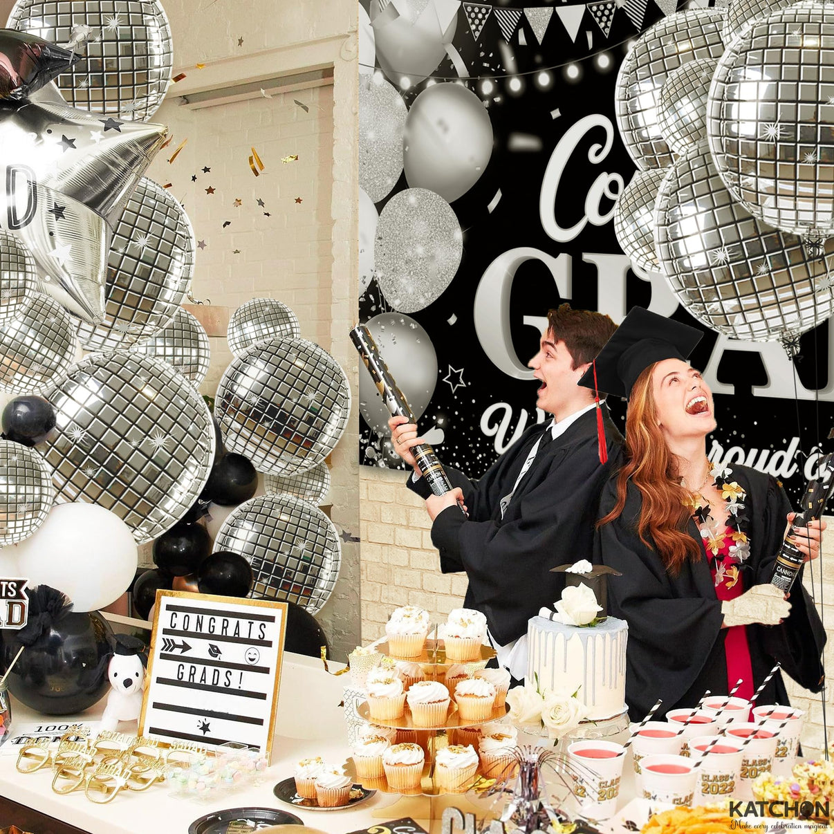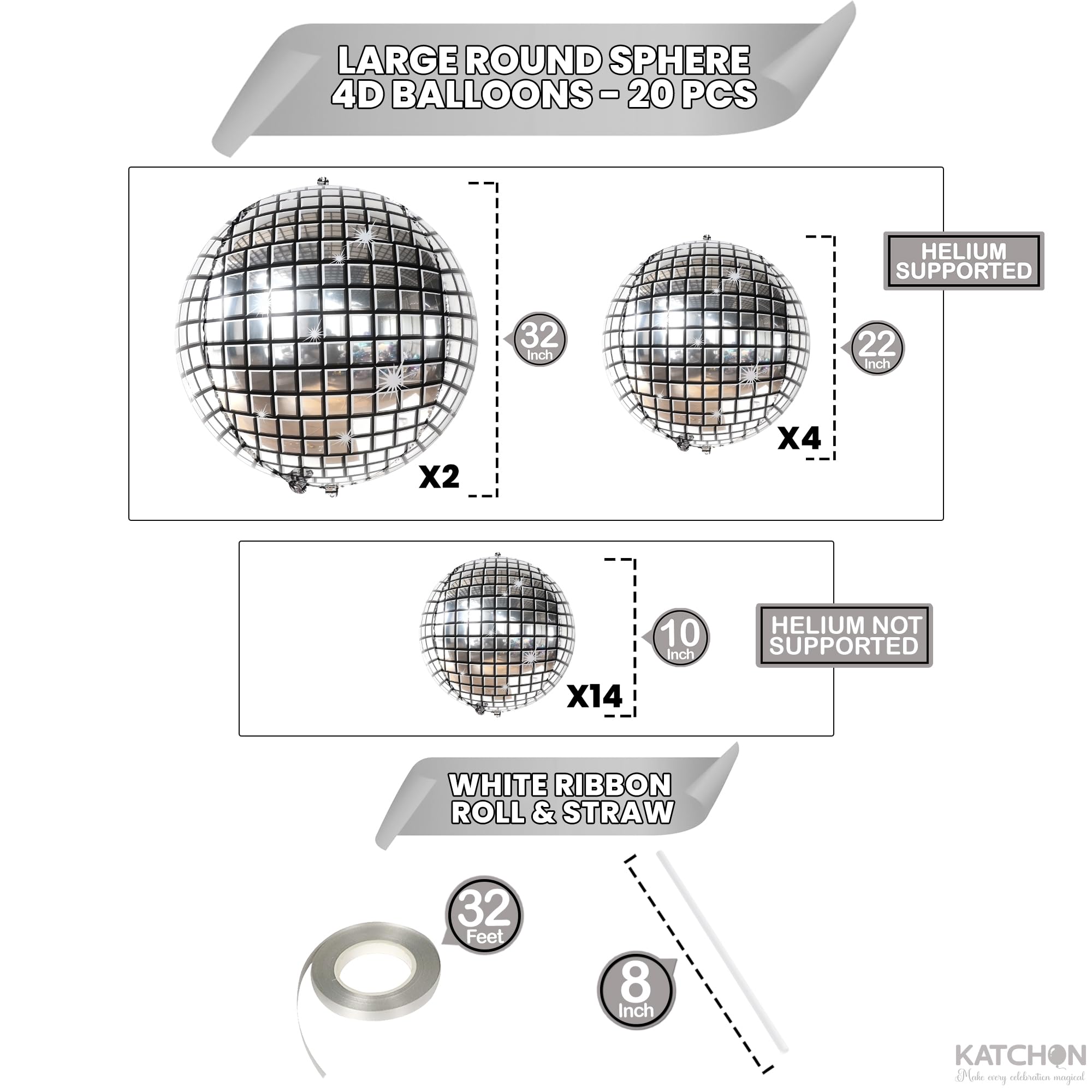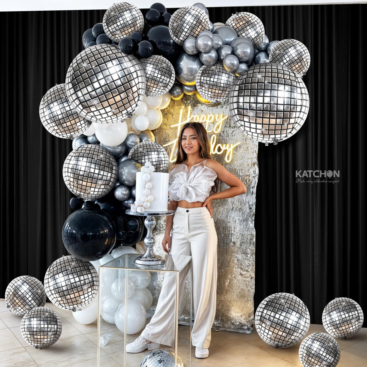 Look no further than our katchon silver Disco ball Balloons which is perfect to party or event!. This mirror-finished disco balloon arch with unique Pattern round metallic balloons for creating a 4D disco balloons decorations. Our silver disco balloons, new years balloons or nye balloons are perfect to any disco party theme