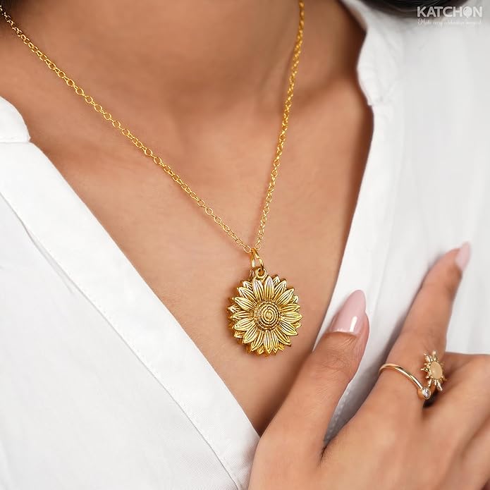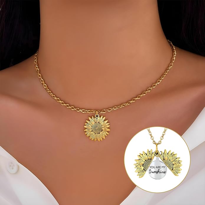 <strong>locket necklace for women</strong> features a sunflower-inspired design that opens to reveal a heartfelt engraved message.
