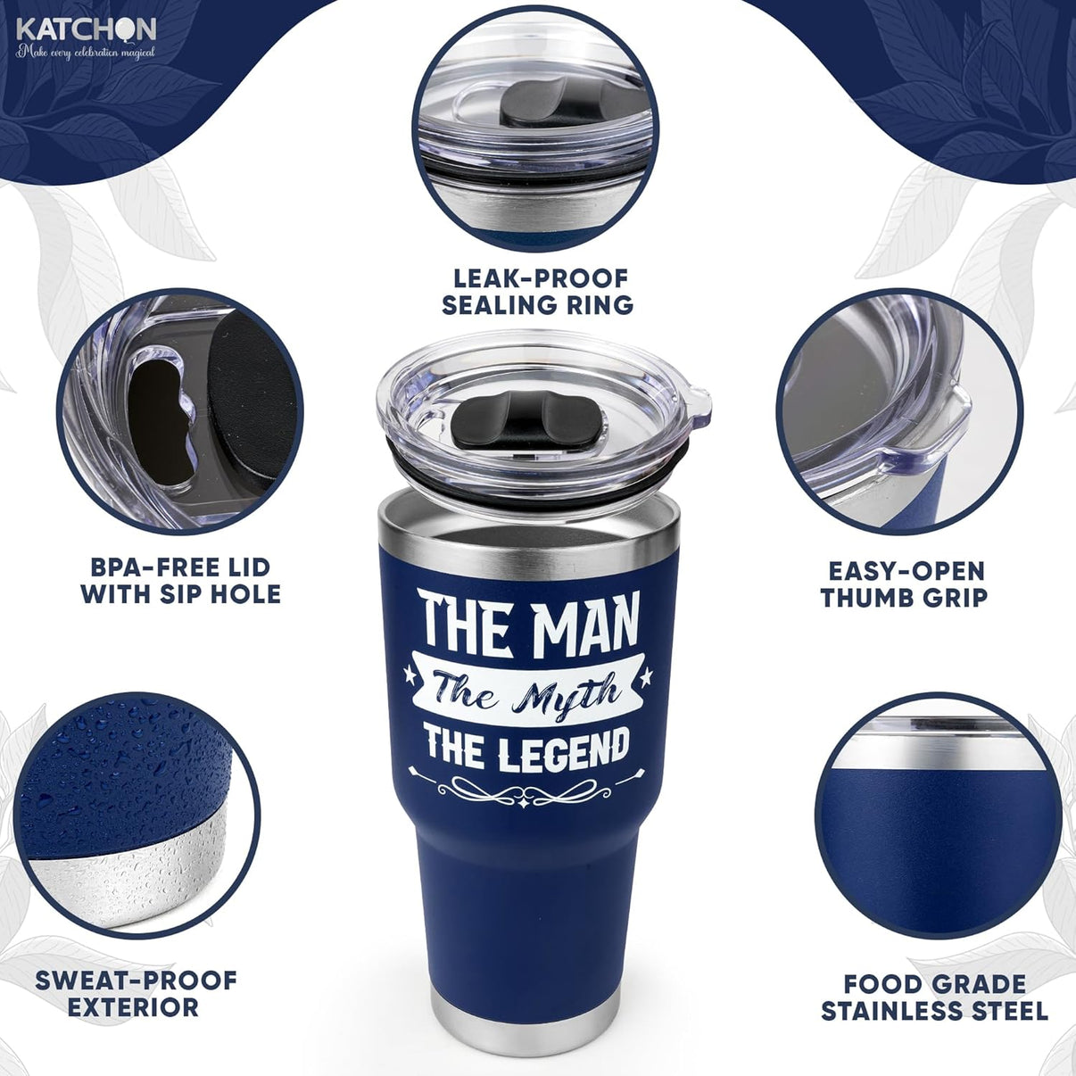 <li><strong>Durable Tumbler:</strong> This stainless steel tumbler boasts a sleek matte navy finish, featuring a fun, bold slogan—"The Man, The Myth, The Legend." It's ideal for both hot and cold beverages and ensures your drinks stay at the perfect temperature for hours.</li>
