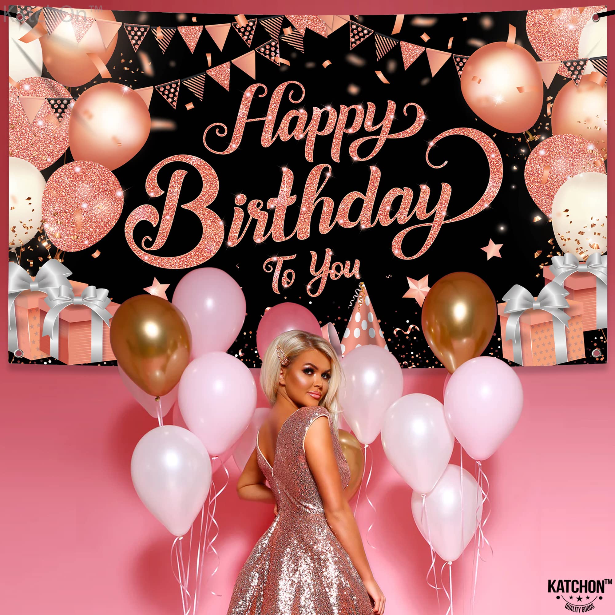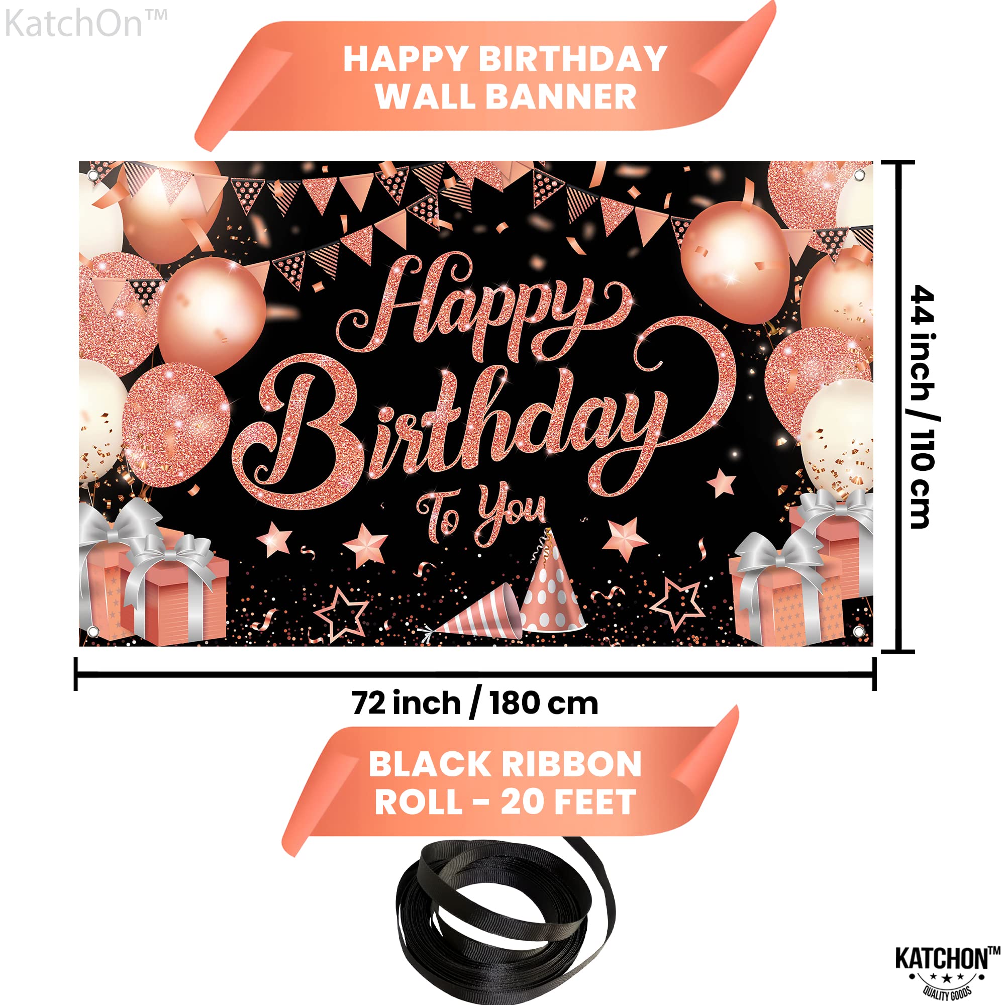KatchOn, XtraLarge Rose Gold Happy Birthday Banner - 72x44 Inch | Black and Rose Gold Happy Birthday Decorations for Women | Rose Gold Party Decorations, Bday Backdrop for Girls