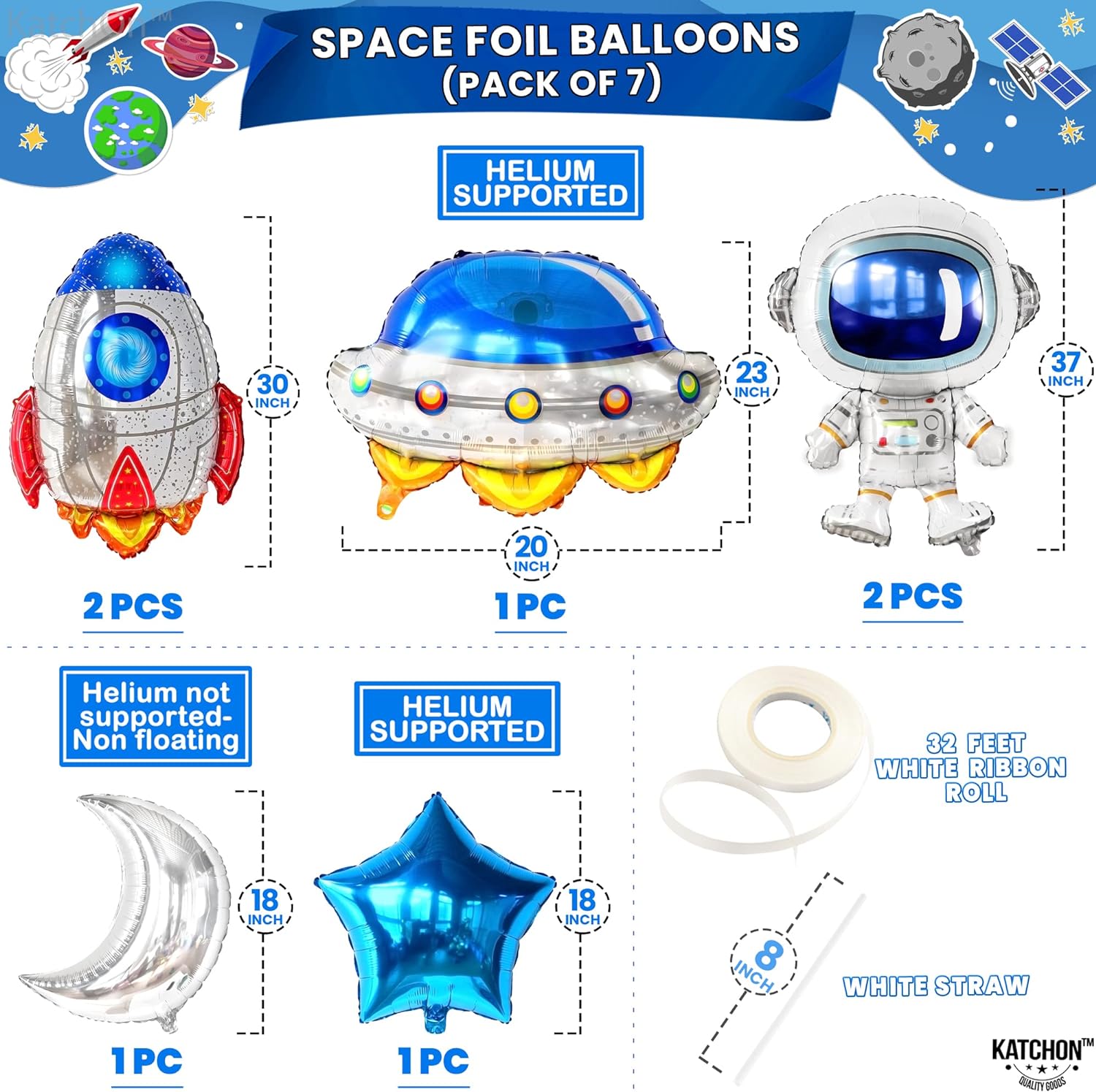 PACK OF 7 | COMPLETE SET: These outer space party balloons set includes everything for your space themed party supplies or space theme birthday decorations with lovely astronauts balloons - 37 Inch, Pack of 2. rocket balloons - 30 Inch, Pack of 2. Moon balloons - 18 Inch, Blue star Balloons - 18 Inch for space decorations for birthday party. These space themed balloons are very attractive, and can be used for space 1st birthday decorations, and outer space birthday decorations.