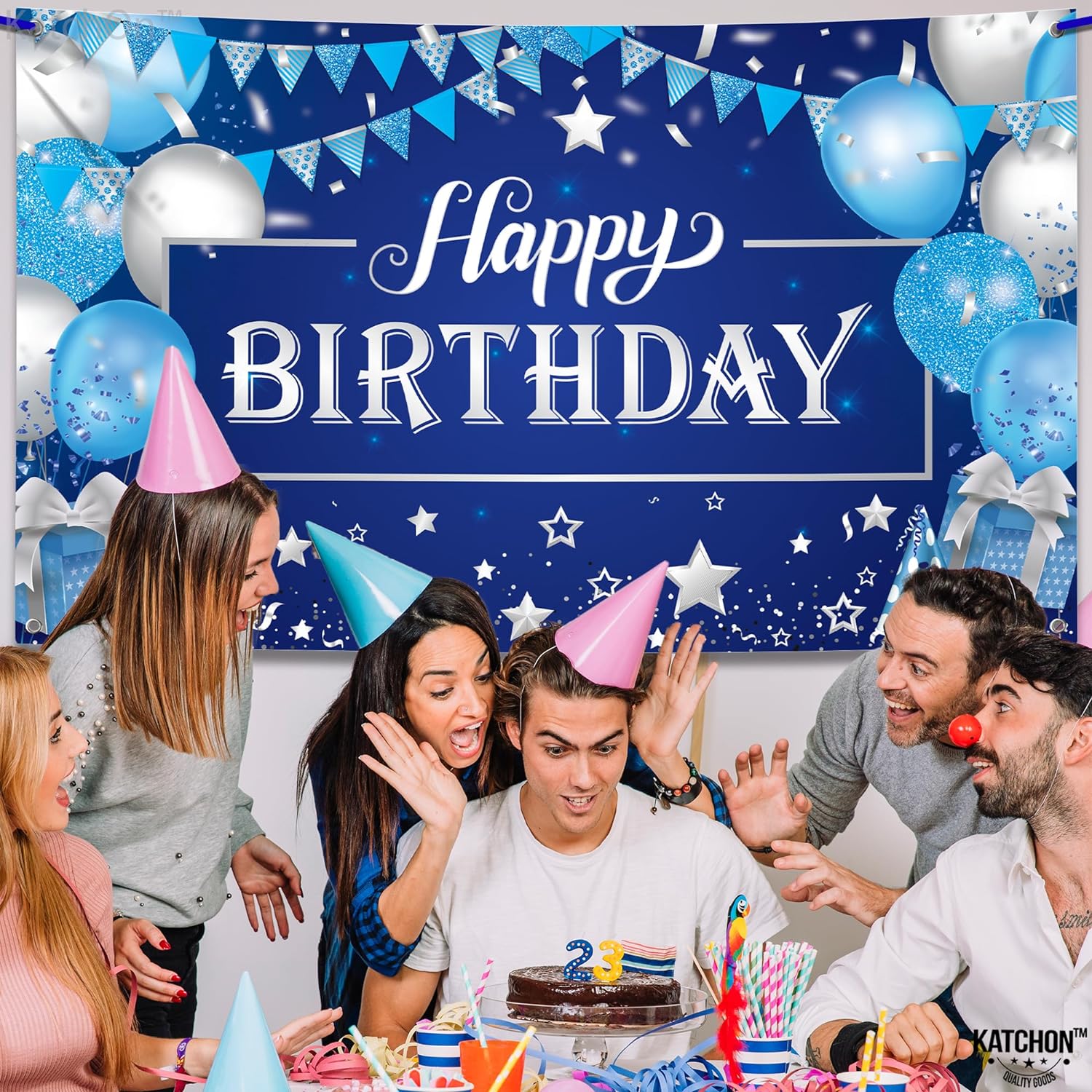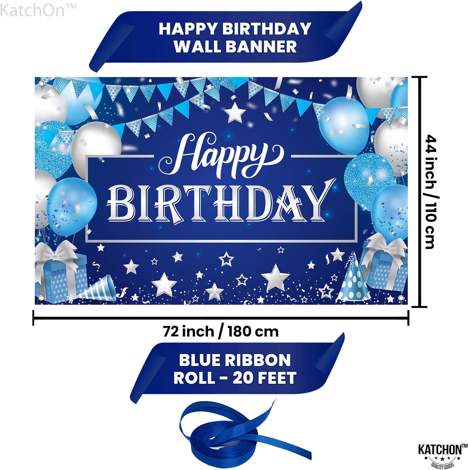 KatchOn, Large, Happy Birthday Banner Blue and Silver - 72x44 Inch | Happy Birthday Wall Banner for Men | Happy Birthday Backdrop for Boys | Happy Birthday Blue Banner, Blue Happy Birthday Decorations