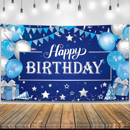 LARGE SIZE - 72 x 44 INCH | LUXURIOUS HAPPY BIRTHDAY BANNER : A alluring Happy birthday backdrop quoting " Happy Birthday" featured with blue and silver elements, printed with blue foil balloons stars, Confetti, gifts that adds the beauty and make it noticeable leaving a deep impression on guests with blue and silver Happy birthday wall banner. Ideal happy birthday cloth banners for men, and Women.