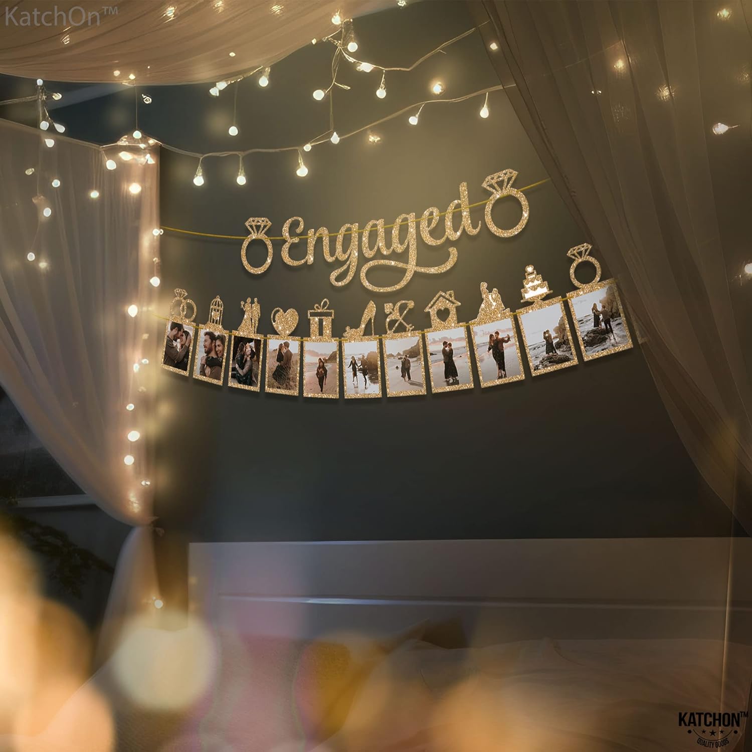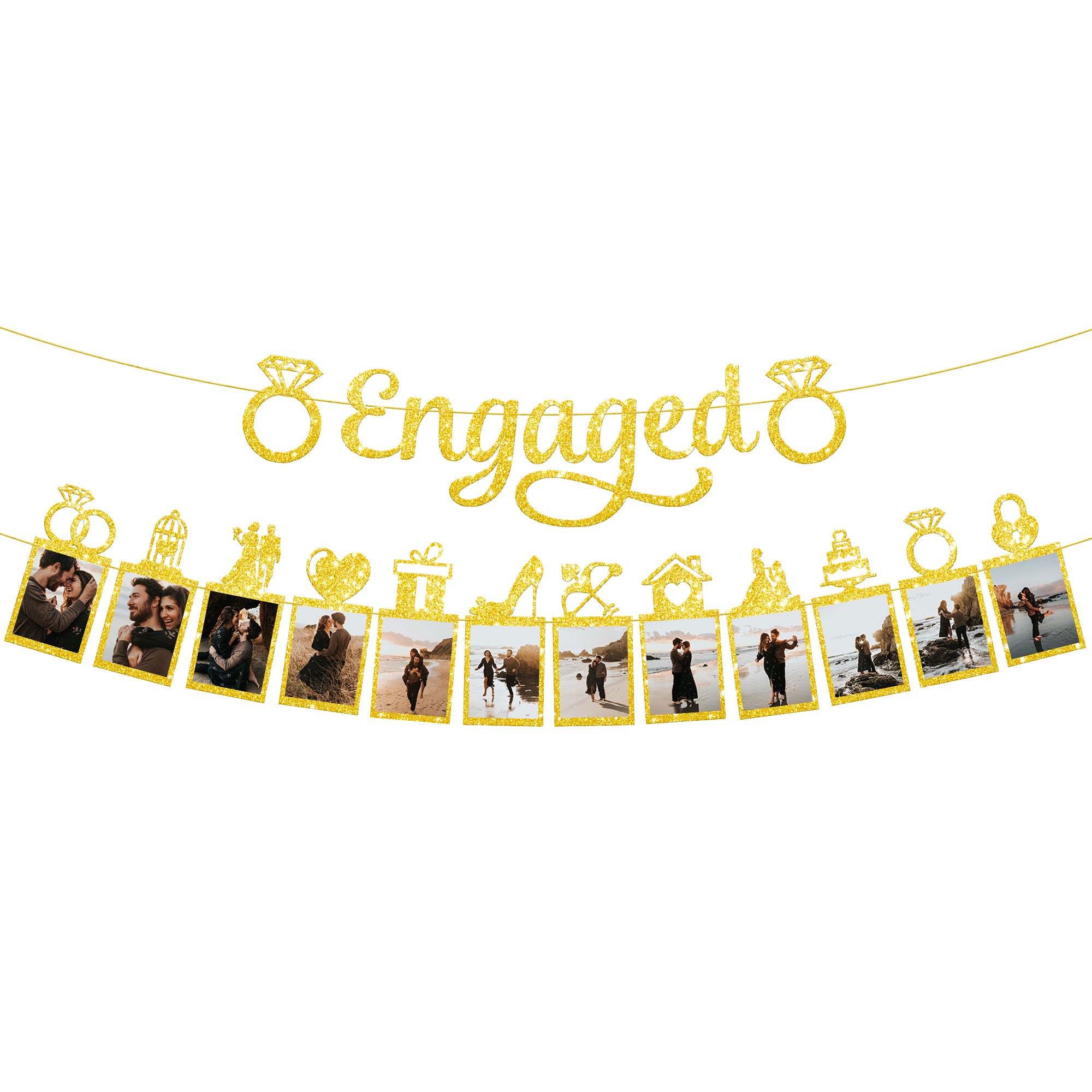 HIGH QUALITY MATERIAL | MADE TO LAST LONGTIME : The glitter engagement party banner that spells “ENGAGED” has diamond rings at both ends. And the engagement photo banner has the frames of engagement rings, heart cage, married couple, heart, gift, bridal shoe, cupid arch, lovely home, proposing moment, wedding cake, heart locket. The bachelorette banner gold are made from high grade thick quality cardstock material. Get this bride to be banner with other team bride banners decorations