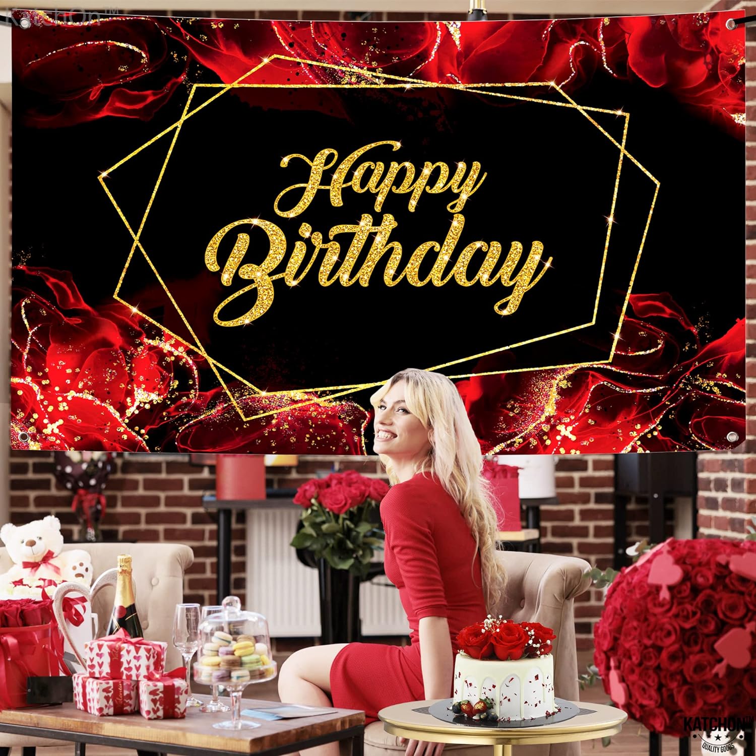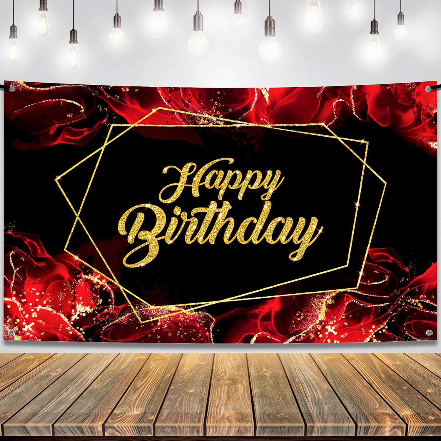XTRALARGE SIZE - 72x44 INCH | RED AND BLACK BIRTHDAY BANNER : A luxurious and large 72x44 Inch happy birthday backdrop for women or men quoting "Happy Birthday" in shinning with the Black, red and gold Background, has everything that will make him happy a complete set of red and black backdrop for birthday party and women that will standout. Perfect red and black banner for red and black party decorations.