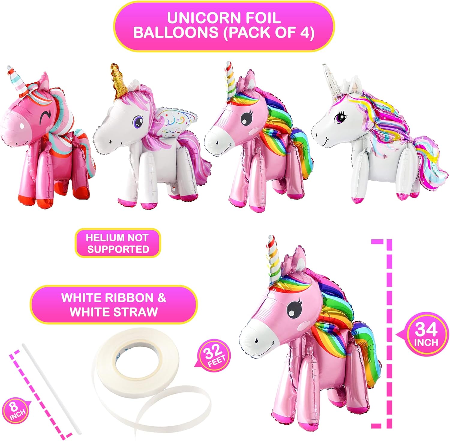 COMPLETE UNICORN FOIL BALLOON PARTY KIT - Turn your party place into a whole new magical world with these stunning mylar unicorn birthday balloons for girls This pack of 4 realistic rainbow Unicorn Balloons self standing and Pack of 1 Extra-Large 46 inch inflatable big unicorn balloon arch kit has different variety of design and style perfect for celebrations. This balloons unicorn is the party Decor you really enjoy it. Perfect giant self standing unicorn balloons for unicorn party decorations.