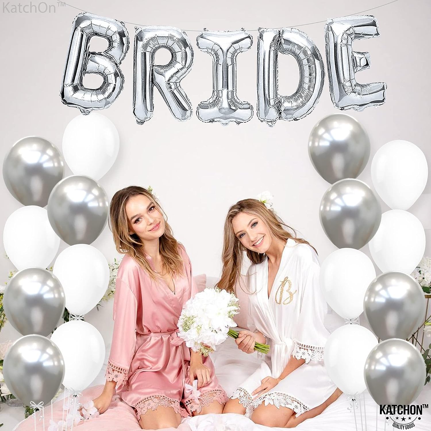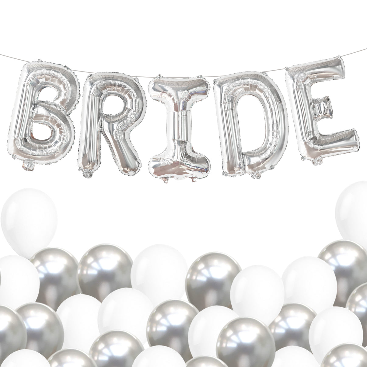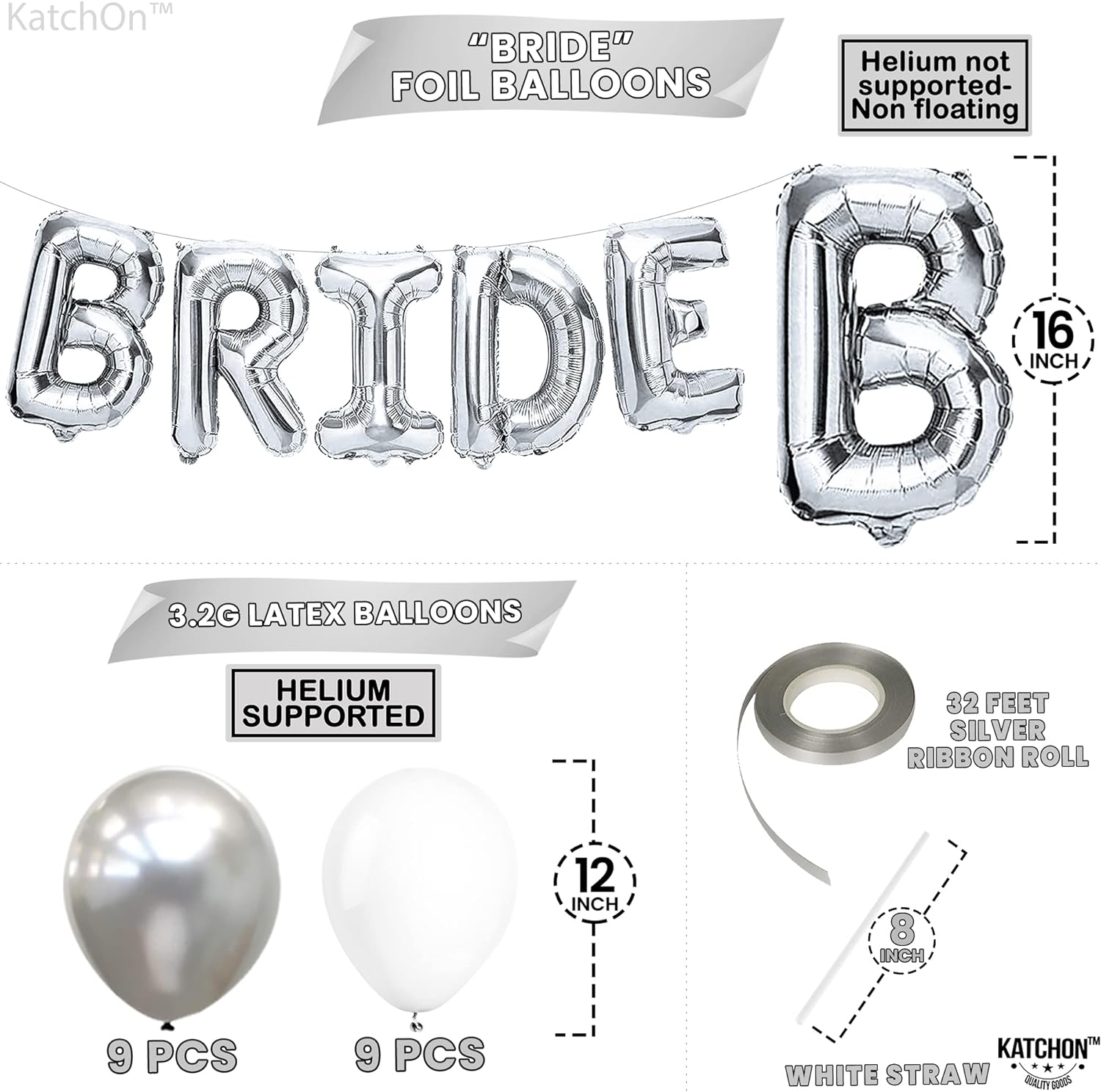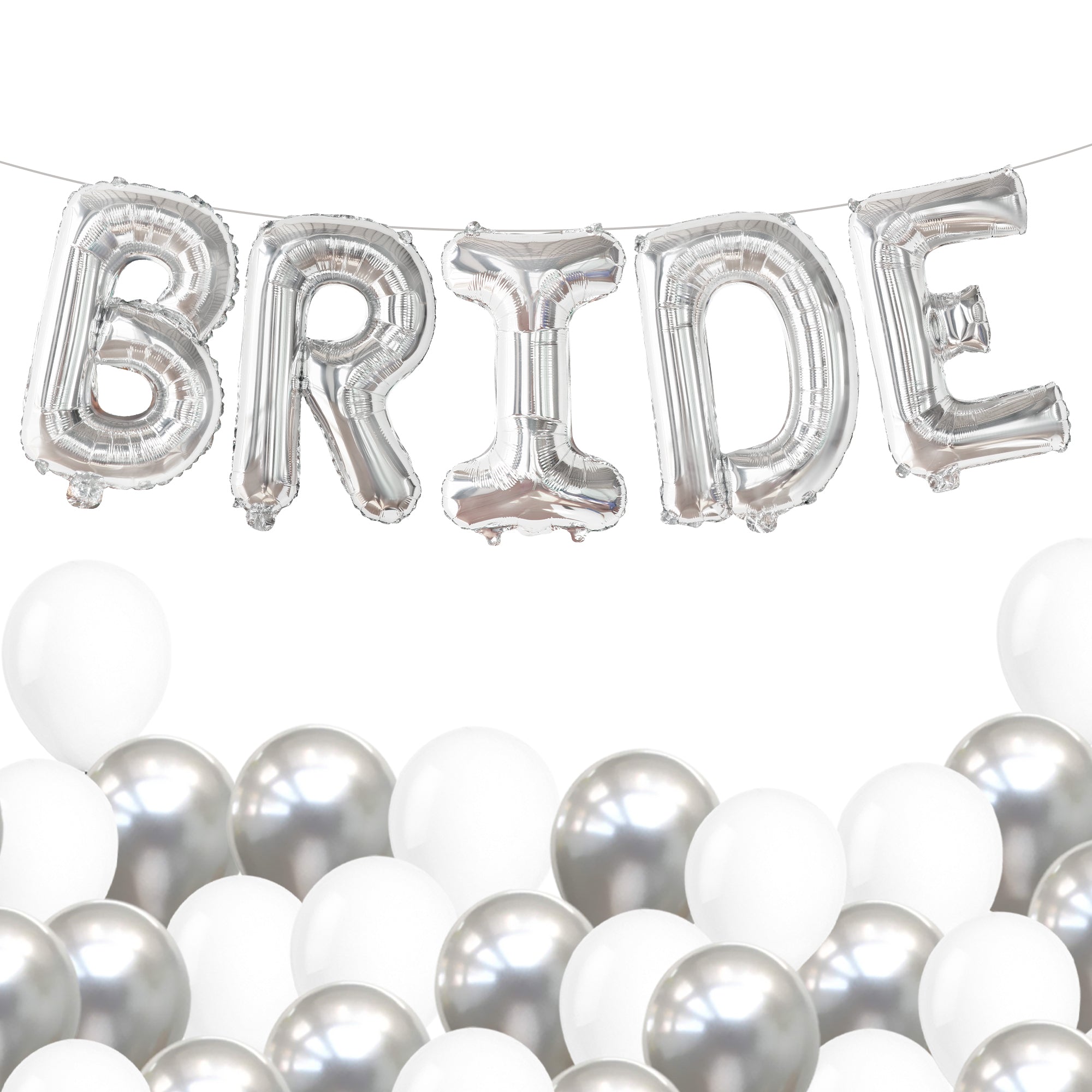 PREMIUM QUALITY | BRIDE BALLOONS AND LATEX BALLOONS: The letter balloons that spell the word “BRIDE ” are 16 INCH and are made from high quality grade "A" Mylar foil and White and Silver latex balloons 12 Inch - Pack of 18 which are helium supported. These bride balloons for wedding day and winter bridal shower decorations are sturdy enough to stand long-hour display and can stay inflated for days. Use a straw to deflate and inflate use straw and only air for the Mylar bride letter balloon.
