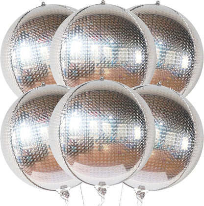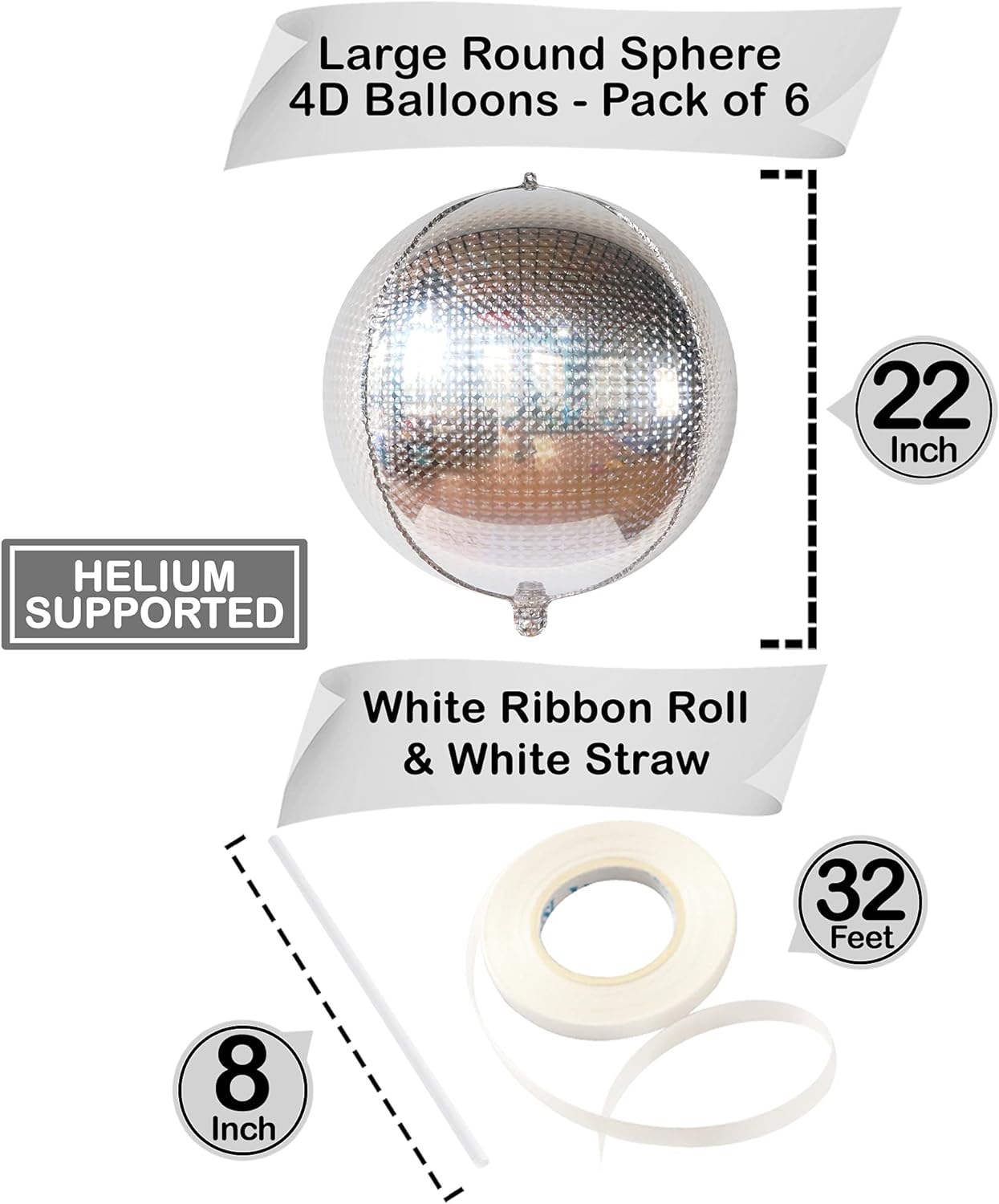 PACK OF 6 | HELIUM SUPPORTED | INFLATABLE : These big holographic silver balloons is can be noticed even from distance in your iridescent party decorations. These giant silver iridescent disco ball balloons pack comes with 22 Inch pack of 6 silver disco balloon with White ribbon and straw to inflate. This disco mylar balloons will stand out if you pair black and silver party decorations. Use this silver foil balloon for wedding decorations, disco party theme decorations.