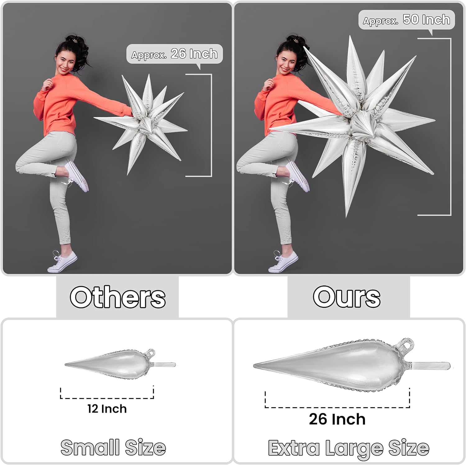 ON-TREND | PERFECT SILVER STAR FOIL BALLOONS : These silver star burst balloons or we can say as star point balloons jumbo for wedding decorations are generally used for many occasions such as birthday, Prom Decorations 2024. The Silver foil star balloon or metallic star balloons are perfect. Pair Silver Mylar balloons with for Bachelorette party decorations, star explosion balloon, with this create winter theme decorations also perfect silver spike balloons for