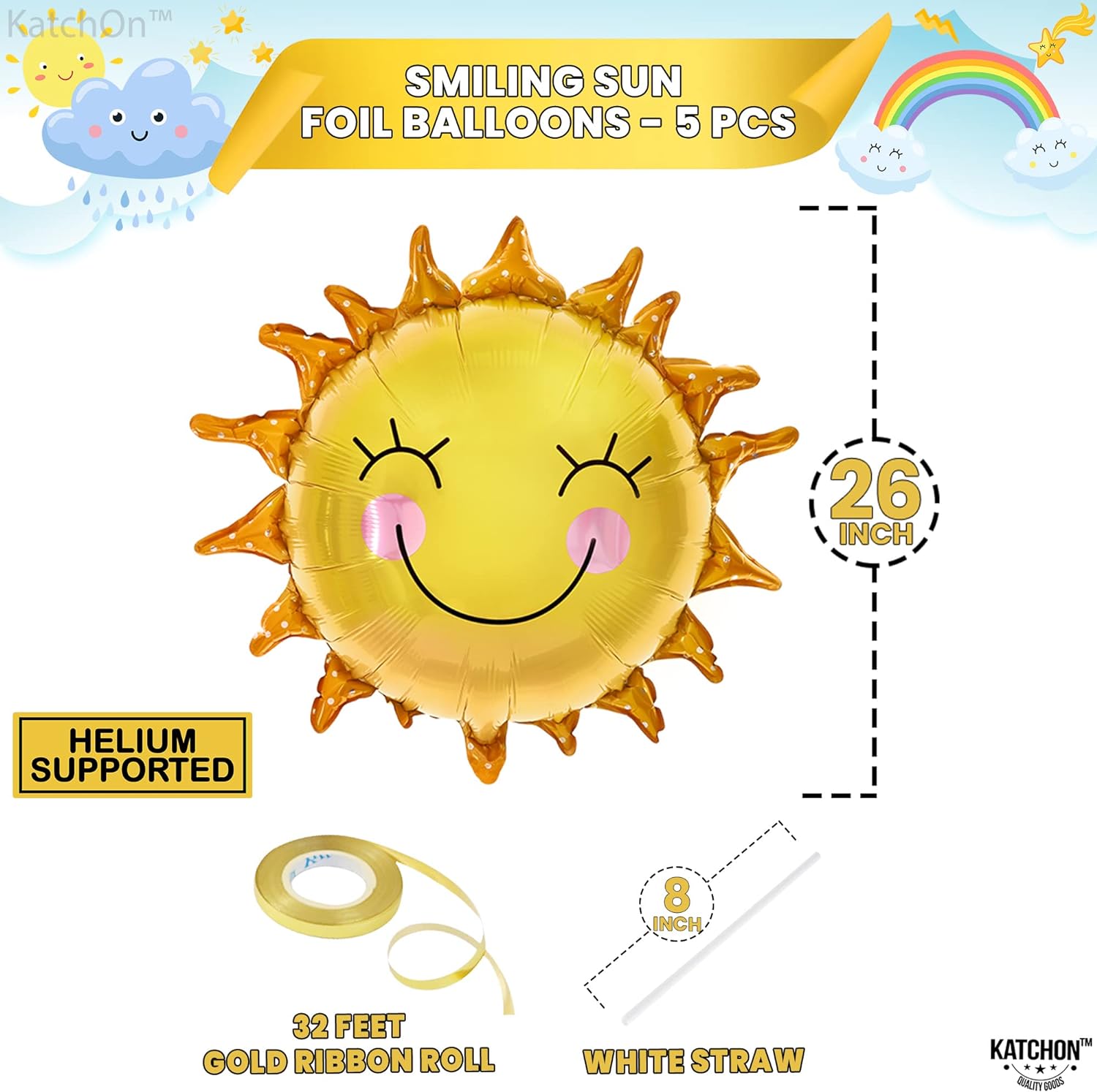 PACK OF 5 | HELIUM SUPPORTED : The kit include helium supported Pack of 5 sunshine mylar balloon. Inflate these sun balloons for party easily with helium, and they will stay inflated for days, Self-sealing valve makes it hassle-free to fill. From simple balloon arrangements to intricate sunshine balloon arch, sunshine helium balloon. Combine these happy face balloons with other balloons for sun and clouds decorations, and other fun in the sun party decorations leaving your guests beaming.