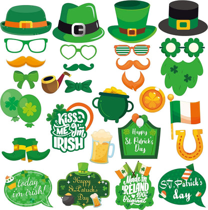 PACK OF 29 DIFFERENT VARIETY OF PHOTO PROPS : This St Patricks Day Photo Props package Includes pack of 29 custom-made st patricks photo props in different design of leprechauns shoes, made in Ireland, glasses, mustaches, shamrocks, beer, rainbow, bow ties, pots of gold, kiss me i am irish, the Irish flag and more. Super fun st patricks day decorations for a night out on the town with st patrick day photo props.