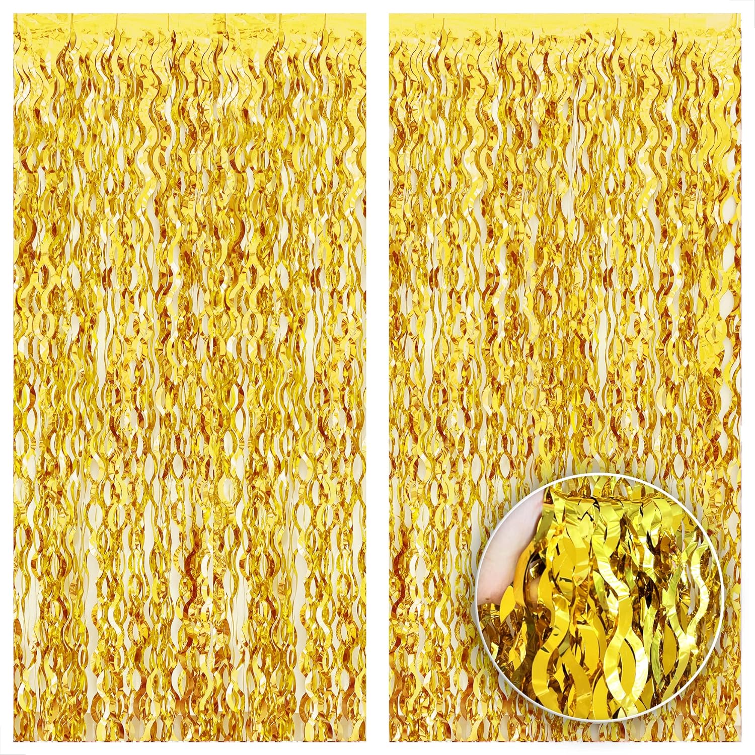 EXTRA LARGE 6.4X6.5 FEET | PACK OF 2 WAVY GOLD FOIL FRINGE CURTAIN : Introducing the Wavy Gold Foil Fringe Curtain with sparkle, a stunning decorative item that will add a touch of glamour and elegance to any event. Make you party more trendy with this pack of 2, wavy foil gold curtains for parties, total the size of 6.4x6.5 Feet. The wavy design of this gold fringe for foil door fringe curtain will create a shimmering and elegant entrence for your party.